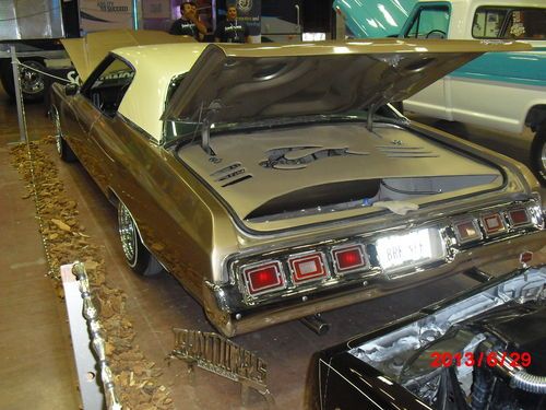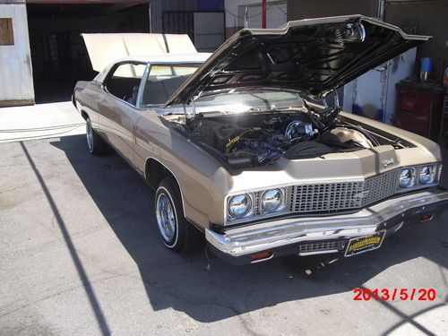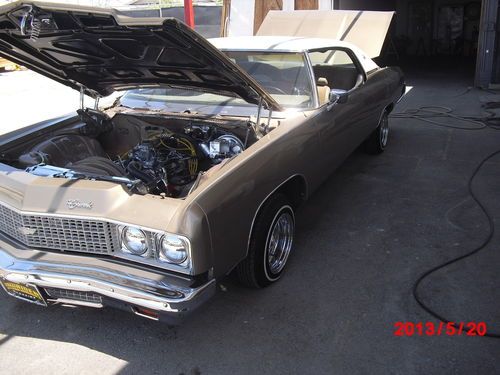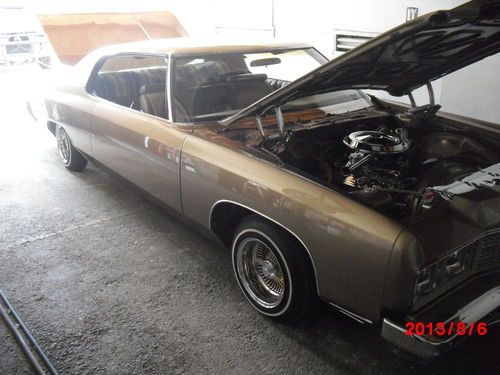 This is a beautiful 1973 Chevy Impala. Show car or everyday drive. It turns alot of heads when driven. Has won many awards in car shows. This car has a new paint job two tone (baige (gold) with white top). New rebuild 350 engine and 350 rebuild tranny. Motor has no more then 100 miles. Comes with 2 barrel carburator. All new chrome, bumpers, trim, engine arms. New stereo system remote control. Popout doors with remote. Brand new air bag ride suspension front and back. New tires and chrome wheels. Chrome jack and croebar. Custome made trunk. This is a show quality car very beautiful. Check out the pics. The only thing missing is the door windows and back quarter windows.