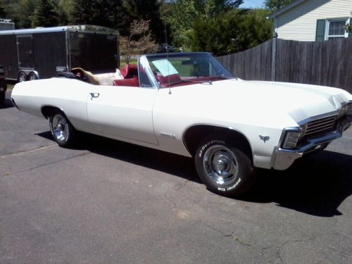for sale is a 67 impala ss convertible all original sheet metal this car is spotless this car has matching 283 ci powerglide trans runs and drives great excellent cruising car. also has power disc front brakes new power top rally wheels dual exhaust beautiful white paint red interior and black top all correct color code interior is original except carpet was replaced there are two trim pieces on the front that could use replacing other than that all trim is excellent or brand new. i also have original wheels with ss hub caps.