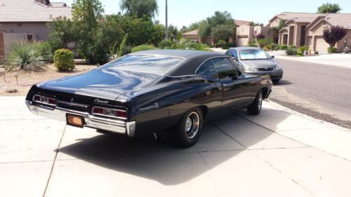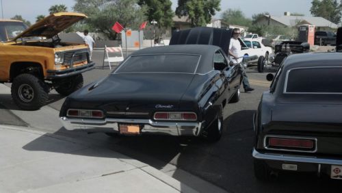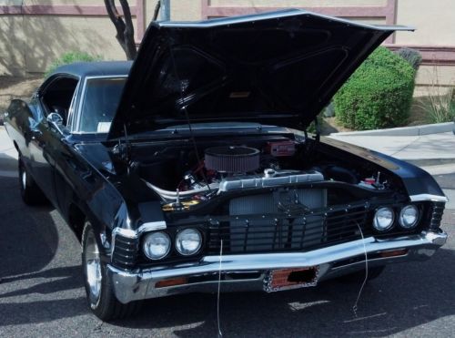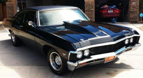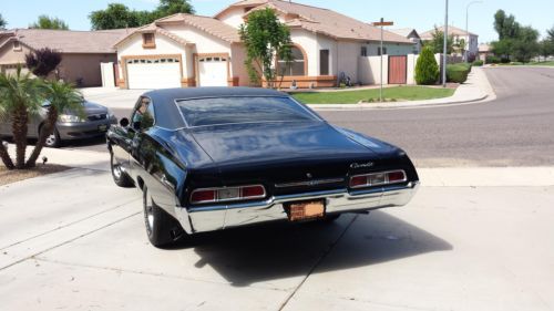 1967 Impala in excellent condition. Motor is completely rebuilt 383 stroker 2 bolt main block with 200 miles on motor (10.5:1 compression), Entire engine compartment is brand new and show ready, all mechanical work done by Modena Motorsports in Scottsdale (modenamotorsports.net), brand new rear end gear ratio 3.42, close to $15k in engine work. Transmission is TH400, No dings, meticulously cared for by owner. New black paint job, Fiberglass cowl hood, New black leather interior with bench seats, K & N Intake, Chrome Tip Exhaust System, MSD Ignition, New shocks and new suspension, New tires, Blue LED Dash Lights, Red LED Custom Dash Turn Signals, LED Tach on steering column, The sound system is incredible, Jensen DVD/CD Deck with 2 Punch 10in subwoofers in Custom Box, Punch Amp, and Sony 6x9 in back and tweeters in Front, Limo Tint, Security System, LED Brake Lights, New Rubber Front & Rear Floor Mats with 1967 Impala Emblem, No AC (It is a musclecar!), Drum Brakes, New fluids, Everything freshly serviced and maintained, All Paperwork Provided, Clean Title in Hand. Not a frame off but as close as you can get.