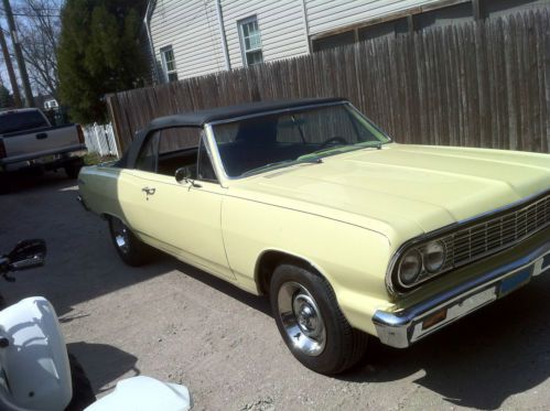 Up for auction is a 1964 Malibu SS convertible. It is non-number matching car, it is not restored and is definitely a driver. Title is clean. At some point in its life the original motor and trans were pulled. The history, reason and when that happened is unknown to us. When my family got the car it had the motor/trans as seen in the pics, a 350 with a 350 turbo trans. Car also does not have the original front bucket seats, or console, per the VIN and Trim codes thats what originally came with the car, and its what all SS came with. I did pick up an original console and floor shifter that I will sell separately if the buyer is interested. Also at some point a previous ower did repairs to the floors, there solid but its not the cleanest job, again this is why I consider the car a driver. After all of that its still a real 1964 SS convertible. So heres what we did with the car: all new harnesses interior and under the hood, new horns, upgraded the front brakes from drums to disc, rear brake job, front end was gone threw, all new ball joints, upper and lower bushings, all new weatherstripping, new door hinges on both sides, new carpet, classic audio radio with MP3 wire for your iphone, ipod, mp3 player, new front kick panels with speakers, new dual stereo dash speaker, also installed dual antennas. Wiper linkage was frozen so that was replaced, correct wiper motor was installed. Exhaust is a dual setup with magnaflow mufflers that have a nice rumble to them, its what was on the car when we got it, its in great shape and is welded, no clamps. Convertible top is in excellent shape, rear plastic window is very clear, top is manual and has to be folded down. I forgot to take a pic of the trunk but its in good and has a new trunk mat in it. The body color isn't the original, From my research of the codes it was originally a white car. This is butternut yellow and it has its flaws. A friend of ours did the door hinges at his shop for us and when we were finished tinkering around he was going to paint it for us, unfortunately his shop was destroyed when hurricane sandy hit the coast here in NJ in 2012. The car runs and drives good and handles like every other car built in the 60's. Have used it to go to car shows and cruise nights and have enjoyed it. I have some extras that I'll be including, the original front kick panels, extra set of headlights, a car cover and anything else I have that goes with it. If I had to list some cons of the car for you guys I'd say its the paint and the neatness of the floor work. The paint is not pealing or dull, it cleans up nice but it has its share of chips and some cracks. Just trying to be upfront, I dont want someone to buy it take delivery of the car and freaking out on me. With that in mind PLEASE ask any questions you have before bidding. If you are local and want to check it out we can set something up. Also - not interested in any trades at all. Thanks for checking out my auction. Must be paid for in full before the car goes anywhere.