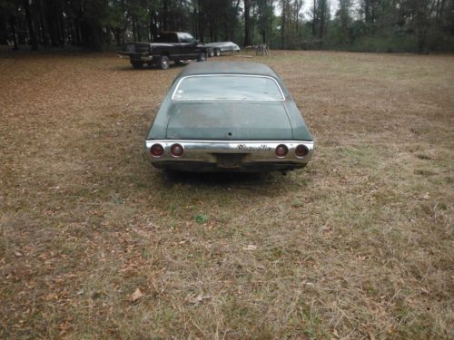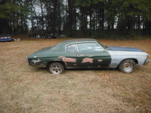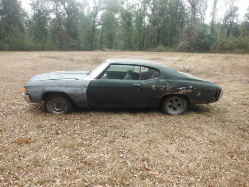2 door hard top. has a 1972 350 engine 70000 miles. front clip from 72 chevelle because of hitting a deer also some damage to drivers rear quarter pannel. some rust on front fender, drivers door, quarter pannels and in truck. mouse ate up spark plug wires and needs carb. i'm the second owner. partial black interior but interior is all there. car was run at least once a yr and was in storage until recently. a questain that was asked regards to condition: i managed to get down and look under the car i cant see or feel any rusted out panels of the floor i tapped on what i could reach and all seemed solid . The frame all is fine no rust other than normal surface rust |