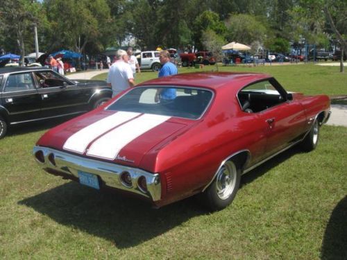 NO RESERVE<<<<<71 Chevelle Malibu 400sbc 400/cam/world product heads/alum intake/holey carb/hooker headers/built turbo 350 trans/shift kit/safety drive shaft loop/12 posi rear with 373/flow master mufflers/new water pump/new master cly/power disc brakes/drum on rear all new brakes/wheels sandblasted and painted correct color/new tires//new interior kit/leather wheel/new gauges,oil.temp, volt,tack ,new wiring harness/ cranberry red paint,black inside,good chrome/runs and drives good. The 400 engine is the correct code for this car.