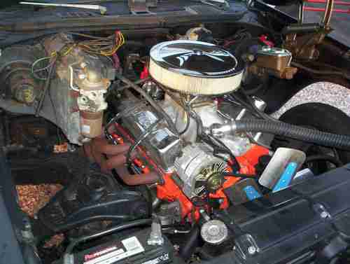 Here we go 355 with angle plug bowtie heads with port work and 208/160 valves,7/16 screw in studs,crowler roller rockers and stud gertiles,Solid lift cam 570 lift,double roller timing chain,flattop pistons forged on stock rods,cast crank,motor has low run time.Wieand 7546 intake,750 holley double pumper,Mallory high fire ing box,Msd dist,accell plug wires,chrome valve covers and air cleaner,350 ATI turbo transmission with reverse manual valvebody,ATI treemaster converter around 3800 stall,custom driveshaft made,10 bolt 7.5 with mini spool and 4:56 gears.