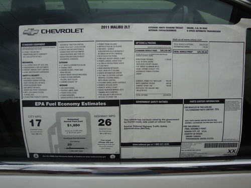 UP FOR AUCTION IS A 2011 CHEVROLET MALIBU 4 DOOR SEDAN 2LT V6 AUTOMATIC LOADED WITH ALL THE OPTIONS, EVEN THE SUNROOF THAT HAS POWER TILT AND SLIDE.THIS CAR IS LESS THAN 7,000 PAMPERED ACTUAL MILES. THE COLOR IS A PEARL WHITE CALLED "WHITE DIAMOND TRICOAT" BY CHEVROLET. IT HAS THE COCOA / CASHMERE INTERIOR AND ITS BEAUTIFUL.THIS CAR IS "STILL UNDER FACTORY WARRANTY" AND IS ABSOLUTELY LIKE BRAND NEW IN EVERY WAY. ITS A NON SMOKER AND GARAGE KEPT.THE MILES ARE UNDER 7000 WE ONLY DRIVE IT 1 OR 2 TIMES A WEEK AS IT WAS MY FATHERS THAT HAS PASSED AWAY.THATS THE REASON FOR US SELLING IT.THE STICKER PRICE WAS $29,185.00 PLEASE LOOK AT THE WINDOW STICKER THAT WE TOOK A PICTURE OF, WE KEPT IT WHEN THE CAR WAS BOUGHT NEW IT SHOWS ALL THE FEATURES AND OPTIONS.WE HAVE A CLEAR CLEAN ARKANSAS TITLE.BUYER IS RESPONSIBLE FOR PICKUP AND DELIVERY. A $500.00 DEPOSIT IS DUE AS SOON AS AUCTION HAS ENDED.BALANCE TO BE PAID IN 7 DAYS. CAR CANNOT BE RELEASED TILL ALL THE FUNDS HAVE CLEARED THE BANK.NO REFUNDS OR EXCHANGES.IF YOU NEED TO ASK ANY QUESTIONS FEEL FREE TO CALL ME @ 4798832475