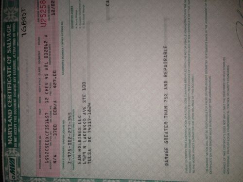 Maryland salvage title, vehicle runs, driver's air bag is the only bag deployed, most of the damage is to the front of the car.