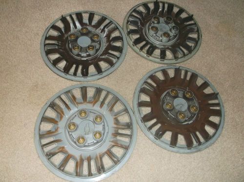 I have four used hub cubs. Two of them are in very good condition. Two of them have little hair strain cracks and wear on the back. See the pictures. The middle cab on all four are in good condition. There is some fading that can probably be painted. Fit 15" tires.