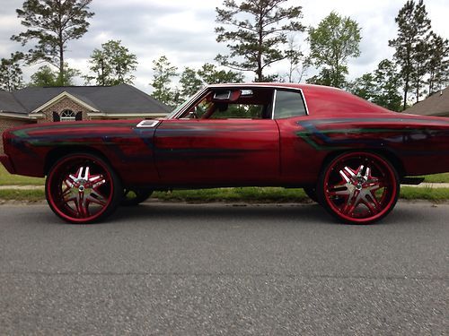 Here you have a 1972 Monte Carlo with custom. Candy house of kolor red paint with cust airbrushed graphics and custom wheels to match.it has a brand new chevy crate 383 stroker pushing about 500hp give or take a few.has custom sound system..this car will take you anywhere you want to go.it is an a/c car.she is ready for carshows and the streets.anything else you want to know just contact me