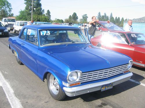1962 nova pro street runs mid 10s in the 1/4. alston's front clip with street machine a arms, billet rack. alston's eliminator ll 4-link rear sub frame and suspension and sprung wheelie bars. alston's fab 9 with pro iron strange center 486 LW ring and pinion spooled. strange s/t 35 spline axels. wildwood 4 wheel disks. strange 3x083 chrome-molly drive shaft. BTE 2 speed power glide with BTE super bracket trans brake and BTE pgh-4 HD tail housing. B and M trans cooler. alston's 10 point cage with X-brace. 15 X14 weld pro stars 33 X15-15 M/T sportsman pro. 434 ci dart little m, comp solid roller can 630 lift comp lifters jessel shaft rocker dart heads and dart intake 1000 cfm 4150. berry grant fuel system with return turn key ready to drive or race.