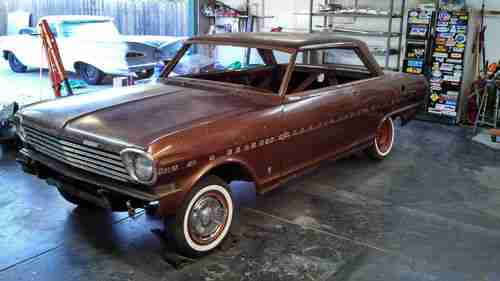 Up for auction a 1963 Chevrolet Nova 2 door hard top. This car is been taken down to a rolling chassis. It does NOT have a motor or transmission. It does NOT have any interior. This is a California Car and does not have any rust except for a small part on the rear passenger side wheel house lip (It is shown in the last picture). I do NOT have a steering interior column or gauge cluster. He is what I do have. I have all emblems and stainless trim for the whole car except for full length stainless side strips (as you can see in the pictures I was in the process of filling those mounting holes). I have all the glass for the car and it is in excellent shape. I have a set of freshly re chromed and restored bumpers that I will include for an EXTRA $400 to the auction winner. This car was an original inline 6 car and the running gear is all original. I have cut open the rear wheel housing with intentions of completing a mini tub. everything is cut out correctly and ready to mini tub or just weld in the originals if you want it stock again. this car has a clean and clear California title in hand. I have too many projects and I just don't have time for this one. So I am prepared to take a loss on it. You could not ask for a better foundation for a custom or restoration. The piece of pot metal script that is on the trunk lid, a piece of that very large emblem broke off about 6 inches from the right side. I know I have forgot something but if there are any questions or concerns please let me know. if anyone needs any other pictures please let me know and I can email them to you. Thanks and good luck.