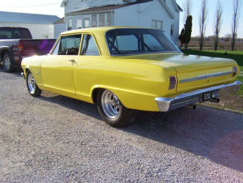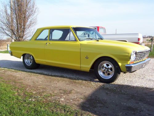 selling for friend is his 1963 nova. new fatman front disk brake setup with dual master cylinder-has adjustable front coil over strut front end with racka nd pinion steering-all steel body with new 3" cowl induction hood-all factory glass with new front and rear gaskets- 3/4 caged- mini tubbed with 9" ford rearend with hardened strange axles 350 gears with spool all new bearings and seals - has frame connectors with ladder bar rear and coil overshocks- 12 gallon jegs fuel cell with gauge and new fuel lines with holley high output fuel pump and regulator-new ez wire harness installed- new oil and water gauges-new monster tach with recall and shift light-new heater core with working heater-new grant steering whell with quick connect adapter steering column-new battery and cables-new drastar wheels 4" front with new tires rears are 10" with 298-55-15 mickey thompson drag radial ets- cd player with ipod acces and 2-6x9-24x5 speakers and 400 amp professionally installed-new carpet -headliner low back seats with new upholstery- custom door panels and kick panels- seat belts-new B&M floor shifter-new 350 turbo with B&M stage II shift kit-B&M holeshot 3000 converter-motor is fresh 383 stroker with scat rods and crank- chrome moly rings- forged pistons with 2 valve reliefs- double hump heads with 2.02 and 1.60 stainless valves- ported and polished new comp double springs- comp roller cam 284 hyd-lunati roller rockers- gude plates- hardened push rods-arp head and rod bolts-rpm edlebrock intake-680 demon carb with electric choke-sniper nitrous setup with 100-200 shot-chrome alum fabbed valvecovers-chrome aluminum pulleys-alum radiator and electric fan-sanderson block hugger headers- new custom duals with magna flow 44 mufflers-cheome 100 amp alternator- new mini high torque starter- car runs 7.12 in the 1/8th with plent of potential for more. please email with questions and i will give you the owners cell. please no 0 feedback biiders unless you contact me first or your bid will be cancelled. deposit will be required with in 48 hours of auction end details will be worked out for payment.clear up to date title in hand thanks and good luck bidding