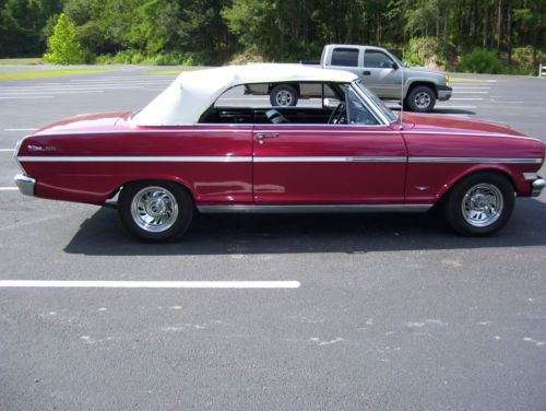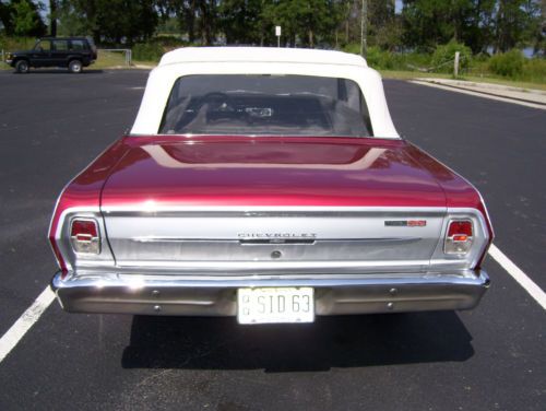 1963 Chevrolet nova super sport convertible. Electric red exterior. Original floor and trunk. Quarter panels have been replaced, not perfect.No dents in the chrome. Runs good and new tires. No mechanical problems. paint, interior, and conv. top in very good condition. paint wrinkled around center hood chrome. Small bubble right door bottom front. |