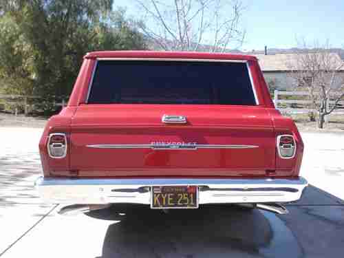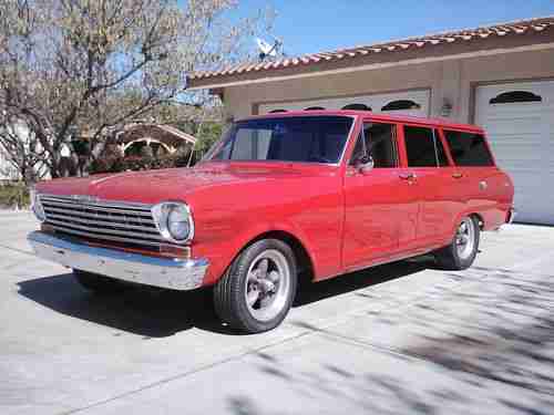 For auction is my 1963 chevy nova wagon. This car is very clean, no rust. Always garaged. Body is very clean with straight lines paint is about 5 years old. On the inside this car has a custom grey tweed interior, tweed headliner and dark grey carpet. Interior design resembles original factory design. Sony cd player with kenwood speakers. Auto meter tach. with gauge cluster for water, oil, and vac. Grant steering wheel and original dash gauges. Dashboard is in great condition. Rear hatch operates great as well as rear window crank. Under the hood is a 350 small block bored over to 383ci, turbo 350 trans. with a B&M ratchet shifter, 400 crank, headers, and dual exhaust. Puts out near 400hp. This is a fast wagon with lots of torque. American racing wheels with clean chrome all around, this car gets a lot of looks and sounds great. Wiring in this car is mostly original and passenger side rear door wont open. Linkage needs to be fixed. All in all this is a very solid car that needs minimal work. Happy Bidding!