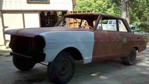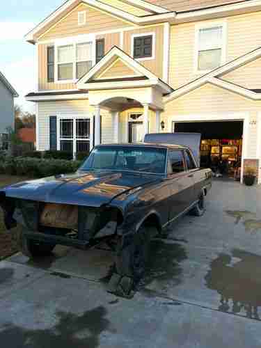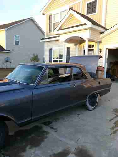 This a 1964 Chevy nova it has many parts the paint was done about a year ago it's gun metal. The motor is a 327 out of a corvette the seats are original blue. It has a Manual brushed steering column, power brakes all the way around, two hoods one is a cowl on the car the other is primer red, carpet in the box, four bumpers,new molding for the windows new mirror and many other parts for this nova. It's rust free