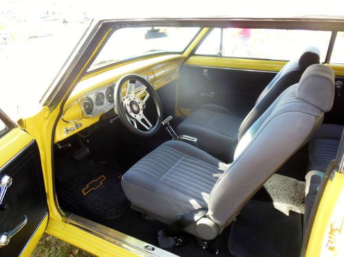 1964 Chevrolet "Deuce" Nova with stunning 74 Corvette Yellow paint job with 4 coats of clear. 030 over 350 with double hump heads, Edelbrock carb, mild cam, aluminum intake, aluminum radiator, headers with turbo mufflers that sound oh-so-sweet.,Aluminum trans cooler, aluminum water pump, high torque mini starter, Hurst Z Gate shifter, 30 miles on New tires and wheels. Radio delete car with new black carpet and door panels, grey bucket seats, new headliner, fiberglass front fenders, goes down the road straight as an arrow. You will not find a better looking and running Nova at this price. Car is ready to go to your local car show and turn heads. Multiple award winner. This is a 50 year old classic car. There are no warranties written, implied or otherwise.