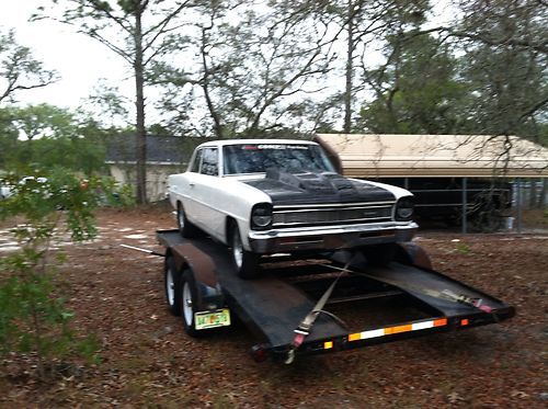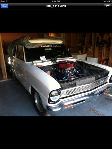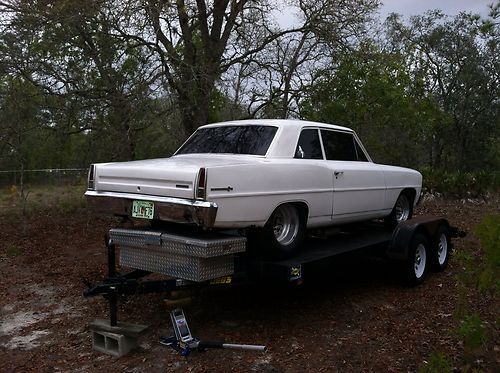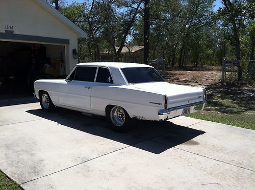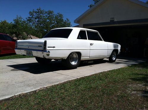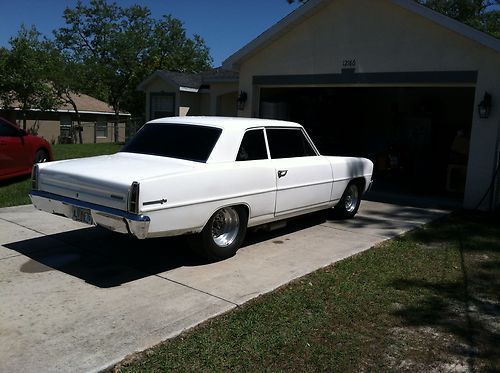 Hello everyone what I have here is a nasty little 66 CHEVY II 2 dr sedan with a long list of goodies ill try to mention everything but I'm sure ill miss a bunch drive this car on the street as I have a clear Florida title or race it since it loves the track it has a 355 sbc with a lot of goodies such as camel back heads , msd dist, team g intake ,Holley 750 cfm carb Doug's 3 1/2 " fenderwell headers miledon pan 2 stages of nos,it has a 175 kit and a 225 kit , has a turbo 350 with a turbo action manual vavle body ,trans brake and stall, has a 9" rear with 4:1 gears moser spool and axles ,caltracs , mark Williams drive shaft, car hass full electronics with a msd digital 7 box and Wilson nos board , all lights on car work even has high output head lights in it car has a 10 point cage with swing outs and is Nhra cert , car has all autometer gauges with recall tach , kirkley alum bucket seats and rear seatis covered to match turbo action shifter 4wheel disc brakes all aerospace itch line lock aluminum fuel cell with aerospace 400 gal pr hr pump all aerospace fuel regulators car has crager superstar 302 wheels just like alumastar s aerospace battery boxes can fit a 275/60/15 under it has licks on it now 3. 1/2 flowmaster exhust car ran 5.90's with another 355 in it has never been run at track with new motor car has a glass hardwood 4" cowl on it other then that the body is all metal very nice car have well over 35,000 in it this will be your chance to own a sweet 66 CHEVY II please keep all offers serious and ask anything you would like to know the answers to thanks for looking