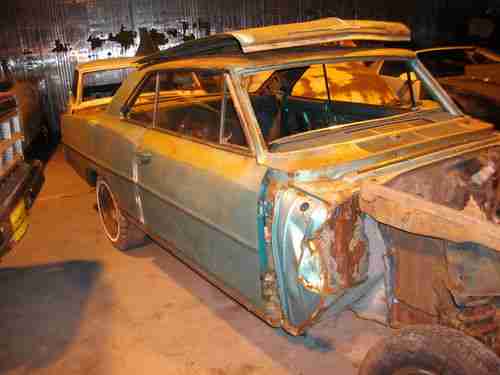 1966 nova 2 dr hardtop,needs full restoration floors trunk firewall repair frontend,frame is good doors are good quarters are fixable trunklid is good.some exta parts are included 4 inch bolt on harwood fiberglass hood grill ,front valance pan rear window no windshield car is a roller no motor or trans was 6cyl auto 10 bolt rear any ?'s call 570-294-5323
