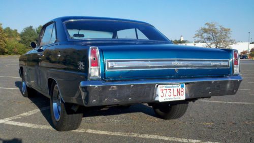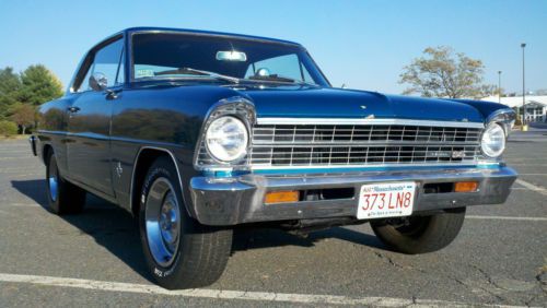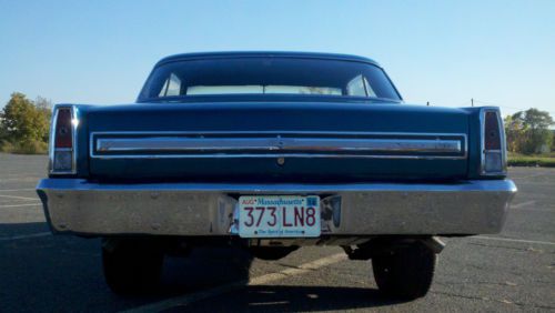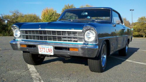 This Super Sport model is 1 of only 214 produced in Oshawa, Ontario Canada. Back in 1967 the original retail for a 1967 Chevy Nova SS was approximately $2,487.00. Today the NADA lists a low retail as approximately $12,250.00, and average retail as approximately $33,600.00 and a high retail as approximately $46,400.00. Go to NADA.com and pump in your zip code and see for yourself. . The car is currently titled and registered in Massachusetts with a current inspection sticker and can be driven anywhere, please come see and drive for yourself. Most things are original to the car with the exception of the current V8 motor and the few after market parts. The motor is a 1973 Chevrolet Corvette 350 block with Comp cams 262H cam and 1968 Chevrolet 327 heads. The transmission is the original 2 speed power glide with the original 10 bolt rear end. Not sure if this was a Canadian option or standard back then, but it has multi leaf springs in the rear. There are some differences between the US and Canadian built cars. Call me if you would like to know more. The pictures were taken on 10/24/13. Please feel free to click on the pictures and email them to yourself so you can zoom in and better see all aspects of the car. Things that are worth noting or that could be done to this car: The paint and the body are in ok shape in most areas. It has an older repaint of the very rare original Tahoe turquoise LL code option color of the car. Please look closely at the existing paint and body on the driver’s side lower door and lower portion of the quarter panel behind the door. The lower portion of the driver’s door and rear quarter panel should be skim coated and repainted. The carpet is faded. There is, approximately, a dime sized hole in the original headliner on the passenger’s side close to the sun visor. Please look closely at the original seats because they do have rips on the top outside bolster seams. But there are no rips or tears on the seat bottoms and backs. There is less than typical rust through on the lower chassis cross members, floor areas and also below the front inner rocker. The tires are ok, but do have some dry checking. Missing the lower SS anodized aluminum trim. Brakes need to be bled for a firmer pedal. Heater works great, has original front and rear seat belts, still retains the original beautiful console and shifter, original tinted windows and back glass. After market things that it has or were done in the past: Edelbrock 1405 carburetor, Edelbrock performer intake, Comp cams 262H cam and lifters, short water pump, heater hoses, vacuum hoses, upper and lower radiator hoses. Mallory unilight distributor, Crane fire wire 25 ohm ignition wires, Jacobs magnetic induction coil chrome, stainless steel flex fan, no name valve covers and air cleaner, Jacobs electronics opti timer controller, long tube exhaust headers with 2 1/2" exhaust, battery cables, fuel tank, fuel sending unit, headlights, Power Master high torque starter. If you are serious about this vehicle please call with your concerns. For questions please email thru ebay messaging or call 1-978-808-7771 or 1-978-750-8834.