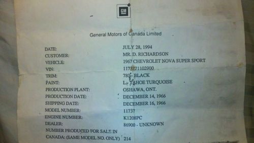 This is a rare Canadian built example of a 1967 Chevrolet Nova Super Sport Hardtop. Full documentation is available for this vehicle through General Motors of Canada Limited. I have a partial documentation on it. Please see second picture. You cannot get documentation on US built cars, unless it was saved when new.