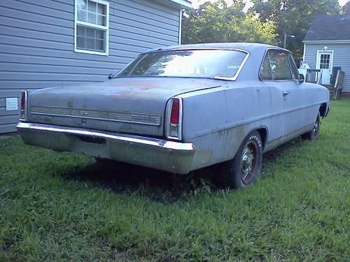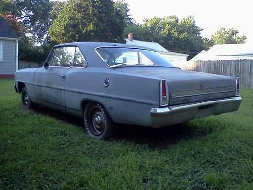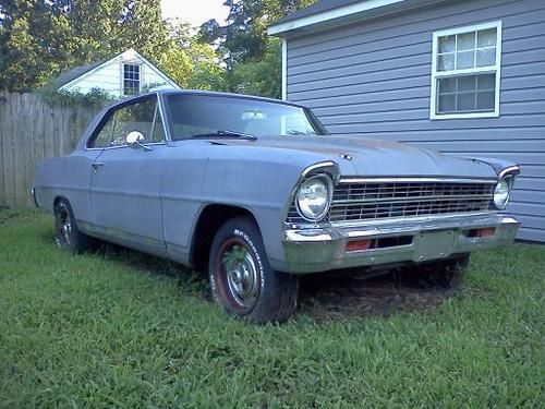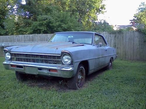 Up for auction is this 67 Nova, or Chevy II, whichever you prefer. It is, in my opinion the real Nova/ Chevy II, the 2 door hardtop, not a "post car". Overall she is in good shape ready to be restored or drop a powerplant in and have the ultimate "sleeper". She is complete as the pictures show, but the interior is missing and it is not running at the moment. She did run decently until I pulled off the manifold and gave it to a friend that needed it about 8 months ago. The floor pans are nice no holes or real cancer issues. The trunk also is in very good condition. I have quite a bit of parts both new, re-pops, and original. She has a modern fuse upgrade, and a new in box Covan dash complete with all Autometer "pro-comp ultra light" guages with all harnesses and sending units. All the locks work with 1 key and the ignition switch is new as well. An uninstalled new glove box with and original light switch. I cannot remember all the parts I have but everything will go with her.