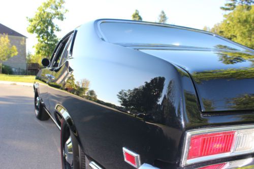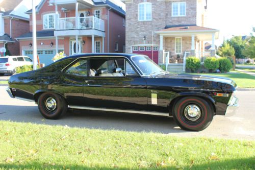 1969 Chevy Nova SS, G.M Documented SS, Black on Black, SS trim package, SS interior, Front bench seat, Original sized 14”steel rims replaced with Copo rims & dog dish caps complete with U.S Royal Safety 800 series red line tiers (Original 350cu,300h.p., 4 barrel turbo fire V8 car), Now has a fresh Chevy 331ci large journal crank shaft estimated 300h.p. Engine Only has an estimated 350km on fresh rebuild, turbo 350 transmission with ATI converter, Chevy 12 bolt rear end with new 390 gear installed last summer, Magna flow 3" front to back stainless steel exhaust system with Flowmaster mufflers & Hooker headers, MSD ignition system, mono leaf rear springs, track bar, Competition Engineering adjustable shocks, in dash tach , B&M ratchet shifter. I have owned this car for 15 years; it is not a frame off or a rotisserie restoration car. It is a perfect driver/street quality car, Buyer is responsible for all shipping arrangements and costs. No trades, No test drives, Serious inquires only please. |