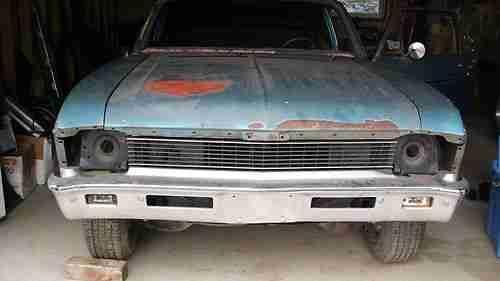 1969 NOVA , NO MOTOR OR TRANNY. WAS TOLD BY PREVIOUS OWNER THE REAR IS A 10 BOLT WITH 3.73 POSI NEWLY REDONE, ALSO TOLD ALL BRAKES WERE DONE, I DIDN'T TAKE WHEELS OFF TO CHECK. SUB-FRAME HAS BEEN SANDBLASTED AND PAINTED WITH NEW DISC BREAK SET UP ON IT. FLOOR PANS HAVE BEEN CUT OUT AND NEW ONES TRIMMED AND READY TO WELD IN. OUTSIDE HEATER BOX WITH BLOWER MOTOR AND INSIDE HEATER ASSEMBLY ARE ALL THERE. ALL GLASS IS THERE EXCEPT FRONT WINDSHIELD. TOP COWL PANEL WAS REPLACED AND LOOKS GOOD. HAVE NEW FRONT AFTERMARKET FENDERS, RADIATOR SUPPORT EXCELLENT SHAPE. ORIGINAL FRONT FENDERS WERE PUT BACK ON CAR WITHOUT TOP SHIMS, THAT'S WHY IT LOOKS LIKE THE LINES DON'T LINE UP BUT WILL WHEN TOP SHIMS ARE INSTALLED. JUST HAVEN'T HAD TIME TO DO SO. INNER FENDERS ARE THERE TOO. HAVE 2 FRONT CHROME PIECES THAT GO ON FRONT OF HOOD, 1 GOOD, 1 SO SO. HAVE TAIL LIGHTS, WINDOW TRIM, NEW DOOR WEATHER STRIPPING, "SS" PANEL FOR REAR, 2 SETS OF WIRING HARNESSES, DASH FOR STICK CAR, 2 DASH PADS ONE GOOD ONE SO SO, HAVE DRIVE SHAFT, TRANNY CROSS MEMBER, NEW BOLT KIT FOR COMPLETE FRONT END, WINDOW MOLDING CLIPS "NEW", BOXES OF OTHER NEW AND USED PARTS, CAR HAS NO FRONT SEATS, REAR SEAT IS THERE, WILL NEED LOWER QUARTERS, ROCKERS CAN BE PATCHED, TRUNK HAS A COUPLE SPOTS IN IT THAT NEED FIXING, DOORS CAN BE RE-SKINNED, TRUNK LID NOT BAD SHAPE, 2 NEW TIRES ON BACK. THERE IS A FEW THINGS I'M MISSING. WELCOME TO COME LOOK AT CAR BEFORE BUYING, CLEAN NYS TRANSFERABLE REGISTRATION FOR CAR. CAR IS VERY SOLID, ONLY SELLING BECAUSE HAVE TO MANY PROJECTS TO FINISH. THE YELLOW YOU SEE ON PASSENGER SIDE PILLAR POST AND REAR QUARTER IS TAPE FROM WHEN I PUT PLASTIC OVER FRONT AND REAR WINDOWS DURING TRANSPORTATION SO OTHER PARTS DIDN'T FLY OUT. ANY QUESTIONS YOU CAN CALL OR EMAIL ME. 518-231-9782 $3500
