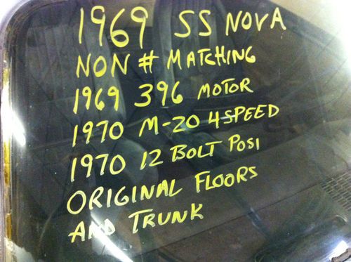 UP FOR AUCTION IS A 1969 NOVA SUPER SPORT - BIG BLOCK 4-SPEED CAR. This car is non-numbers matching but year correct motor. It has a M20 Muncie 4-speed with a 12-bolt posi. The window and vinyl top trim as well as other various parts are in the trunk of the car. This vehicle will need interior work and bumpers. Car is not running. Just put motor and trans in the car. This is a great start on a nice project. Body work is finished. This is a PROJECT CAR. The pictures tell the story.