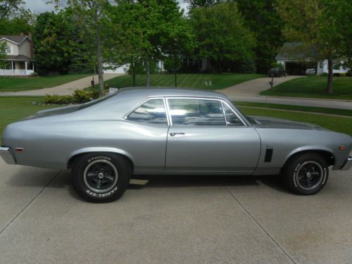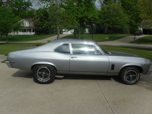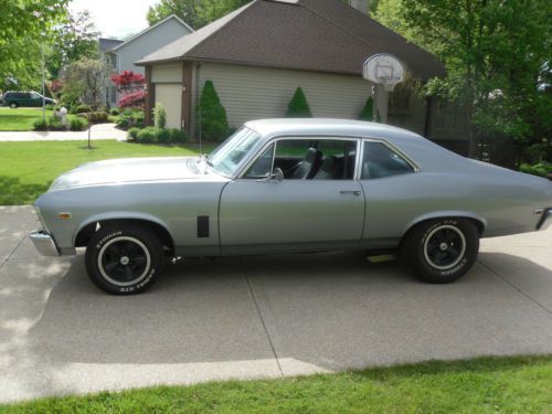 1969 Chevy Nova, 355 cu in Chevy Small Block 4 bolt mains, Muncie M-21 4 Speed, 10 bolt posi with 4.10 gears, 8 point cage, subframe is tied, traction bars, driveshaft safety loop, racing bucket seats with safety belts, full instrumentation, Grant steering wheel, New 255/70/15 rear tires, 215/60/15 front tires, car is not tubbed. New ball joints, tie rods, springs, bushings, stabilizer links, rear springs. Body and underside are rust free. Interior is excellent. Chrome and trim are nice. Painted in Cortez Silver. Very nice Street/Strip terror. Everything works. Here are the specs on the motor from the machine shop, 69 NOVA ENGINE SPECS SHORT BLOCK: