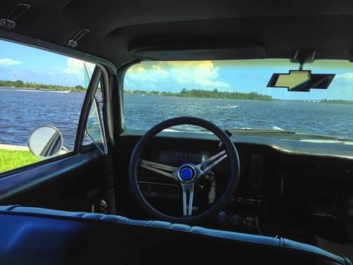The interior is practically mint condition with two bench seats and lap belts. The steering wheel is a chevy hot rod model and the carpet is very nice. The only issue with the interior is the original A/C controls bind up when you go to turn it off, so the car has been equipped with an A/C kill switch underneath the steering column. This doesn't really effect me because I dont use the A/C, so I cut the V-belt on the compressor for the extra horsepower. All it takes is a new V-belt for the A/C to blow.