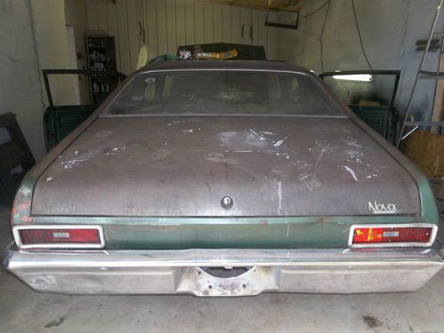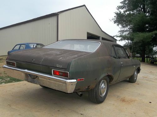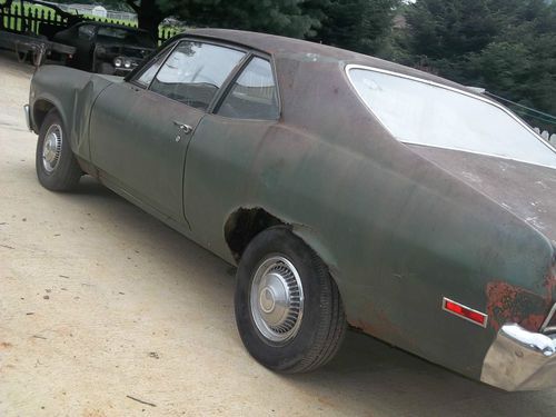 HELLO AND WELCOME TO MY AUCTION.. UP FOR GRABS IS MY 1970 NOVA . IM SELLING IT DUE TO I AM HELPING MY SON WITH HIS 1968 CHEVELLE PROJECT. WHEN I PURCHASED THIS CAR I HAD INTENSIONS OF BUILDING A LITTLE SLEEPER . I WAS GONNA LEAVE IT RUSTY AND ROUGH LOOKIN AND ONLY INSTALL NEW FLOOR PANS AND ADD ANOTHER ENGINE.. ( THERES A GREEN ONE ON U TUBE THATS TWIN TURBO AND ITS A BEAST , SO MY PLANS WERE TO BUILD MY OWN VERSION OF THAT, BUT NOW PLANS HAVE CHANGED SO YOU CAN MAKE IT YOURS.... ) I PURCHASED IT FROM A MAN WHO BOUGHT IT IN 1973. THE CAR WAS BORN A 6 CLY 3 ON THE TREE THEN AT SOME POINT WAS PUT IN THE FLOOR.,, BUT IT KEPT HANGING UP IN GEAR SO I INSTALLED A SAGINAW 4 SPEED AND FIXED THE PROBLEM.. ( THE 3 SPEED COMES WITH THE CAR IF YOU WANT THE ORIGINAL TRANS.. ) IM INCLUDING 2 NEW FLOOR PANS WITH THE CAR PLUS 2 BETTER CONDITION FENDERS AND YOUR CHOICE OF THE REAR BLACK SEAT OR YOU CAN HAVE THE ORIGINAL GREEN TORN ONE.. THE OLD RACKETY 6 CLY FIRES RIGHT UP AND MOVES THE CAR IN AND OUT OF MY SHOP WITHOUT ANY TROUBLE. ( I HAVE ONLY DRIVEN IT UP AND DOWN MY DRIVEWAY BECAUSE IT DOES NOT HAVE ANY TAGS ON IT.. CHECK OUT THE PICTURES AND MESSAGE ME IF YOU HAVE ANY QUESTIONS 423 292 3883.. JOE.. I HAVE A LOT OF NOVA PARTS I WOULD LIKE TO SELL TO THE WINNING BIDDER IF HE OR SHE WANTED TO BUY THEM TO RESALE..????