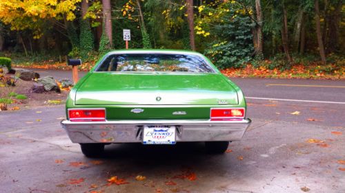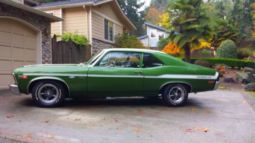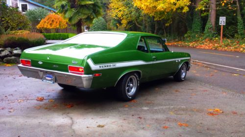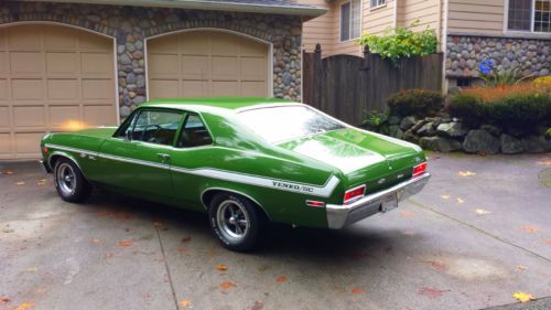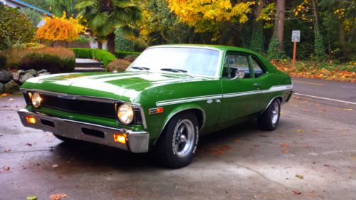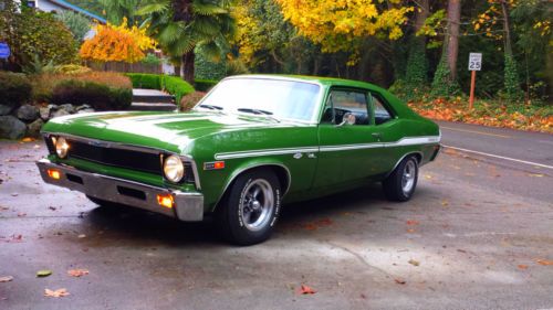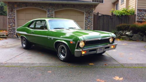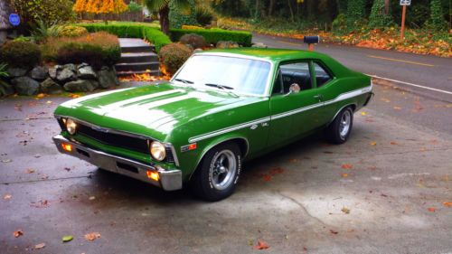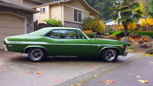 Just in from the builder himself, this 427 Yenko clone is outstanding in every way. No better words or description can be written than the man who is responsible for this sensational car, so I have included his words below. Please take the time to read it in it's entirety and is it very thorough. Please call Mark Murray or John King at 206-227-0471 or 206-818-2297. Chevy Nova Yenko 427 SC Tribute, Rally Green, fully restored, fantastic car like new! This is a wonderful, authentic recreation of a Yenko 427 SC Chevy Nova. I own a restoration shop, and personally built this car for myself over the past year from the ground up with strict attention to detail and quality. It is a fantastic vehicle that delivers the vibe, detail, and performance of the all-but-unobtainable big-block Chevy Yenko Nova Supercar. The Yenko SC Nova has been rightly hailed as the most venerable street fighter ever produced, along with it's cousin the Motion Performance 3 Stage Nova. They were so light, powerful, and fast they were scary... this one still is. With only 36 originals built and authentic cars selling in the hundreds of thousands of dollars, this is a fun and affordable way to own one of the most iconic muscle car classics ever made. You could not build this car yourself for the price... it's an amazing car waiting for the right new owner. The Yenko began life as an original, low-milage, rust-free car. During the restoration process, all the front sheet metal was removed in order to detail the engine bay and subframe to factory as-new condition. All the under hood components are new: Brackets, hoses, belts, pulleys, alternator, power steering pump, water pump, battery, regulator, etc. The radiator, heater box, and heater core are all new as well and are correct factory big block parts. New fasteners were used throughout. The inner fenders, firewall, radiator core support, etc. have all been fully restored as well. Under the hood looks factory fresh and new. The 1967 big block engine is fully rebuilt to approximately 425 horsepower. The block was hot tanked and magnafluxed to assure integrity, line bored and honed, new forged pistons, reconditioned factory steel rods and crank, and the rotating assembly balanced. New high performance bearings, cam, lifters, rev kit, rockers, oil pump, fuel pump, timing set, etc. The heads have been redone including high performance multi-angle valve job, new stem seals, and hardened seats for today's unleaded fuel. The engine features correct vintage factory chrome valve covers, and an Edelbrock Air Gap intake with a new Holley 750 double-pumper carburetor on top. A new MSD HEI ignition with big wires fires the air/fuel mixture, and factory HP cast iron exhaust manifolds are ported and gasket-matched handle the exhaust gast flow like headers, without the header hassle. The engine has been detailed to include the proper 427 Yenko badging, and looks outstanding. The Turbo 400 transmission has also been completely rebuilt including new pump, clutches, line set, shift kit, and converter. The driveline was fabricated of heavy-duty thick wall tubing with factory yokes and heavy-duty U-joints to handle the power. The engine and transmssion have under 500 miles on them since the build; I broke them in personally and the car runs flawlessly. The engine sounds amazing with a very aggressive lope and exhaust tone . A beautiful new true dual 2 1/2" exhaust system featuring Flowmaster Series 40 mufflers and x-pipe crossover exits correctly out back behind the rear tires. The exhaust system features mandrel bent tubing and the nicest welds you'll ever see. The underside of the car is clean, with new brakes all around, custom multileaf rear springs, KYB gas shocks, and detailed front subframe and rear end. The wheels are restored original 1969 American Racing Equipment Torq Thrusts 14 x 7's from wearing new BFG Radial T/A tires; 225/50/14 rears and 205/60/14 fronts for an aggressive, staggered stance. The center caps feature the correct Yenko emblems as well! The interior features new windshield, new factory optional sport steering wheel, new carpet, new seat upholstery including YSC-badged headrests, perfect dash pad, new headliner, new sail panels, new door panels, new sill plates, new package tray, new heater controls, bezel, levers, etc... the list goes on and on. What's not new has been removed, restored, and reinstalled; the interior looks like a new car. Shifting duties for the fully-rebuilt Turbo 400 with shift kit and stall converter are handled by the factory column shifter for an authentic original look. A set of auxiliary below-dash gauges monitor oil pressure, water temperature, and amps. The body features all original sheet metal panels, massaged into near perfection. The doors, fenders, hood, deck lid, etc. were all removed from the car, prepared for paint inside and out, and painted inside and out for a show finish. The paint job is a high-end two-stage finish in factory Chevrolet Rally Green poly (metallic). The paint job was done properly with removal of the existing original finish as appropriate, hammer-and-dolly bodywork, epoxy primer, high-build polyester primer, hand blocking of all panels, sealer, finish blocking, application of urethane base color coat, and application of three high-solids urethane clear coats. After the paint cured, the entire car was wet-sanded by hand and the panels blocked flat, machine cut and polished, and finally hand glazed. The paint job is beautiful and shines like a mirror. All the small details are correct, including the Yenko YSC side stripes, hood stripes, and "YSC" headrest decals. Yenko dealership fender and tail panel badges, 427 fender market lamp badges, 427 tail panel badge, Yenko engine decals, and Yenko wheel center cap emblems. This car is absolutely gorgeous from top to bottom. Look at the reflection in the underside of the hood, deck lid, fenders, etc. They are finished as finely as the exterior of the vehicle. The trunk