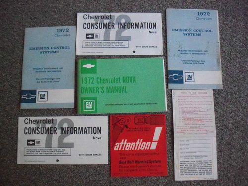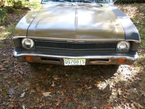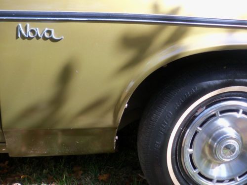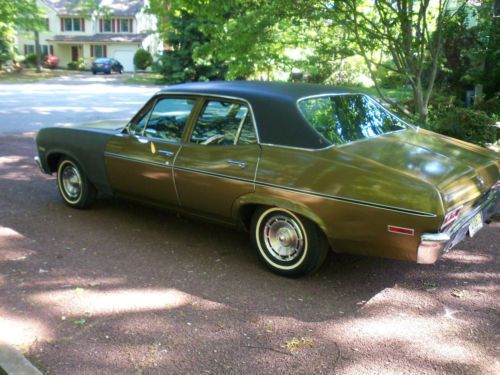 1972 Chevrolet Nova..4 door.. Brown exterior with black vinyl inside and the original black vinyl top ( the top has a few edges turning up )...Original 2 speed power glide.. power steering.. original A/M radio.. Tinted glass.. No air conditioning.. Roll up and down windows..No carpeting on the floors just the original black rubber floor covering.. Original 250 straight 6 cyl that's never been out of the car...All original interior that is in great shape with the exception of the drivers area that has a small split...back seat has never been sat it.. original full wheel covers.. original like new head liner.. All numbers match.. never been cut up , misused, or modified in any way.. Everything works...Everything opens ,closes and locks.. One owner with 90k original miles...Garage kept all its life... Here's the story,,, This was my parents car that they bought new in 1972 at Luci Chevrolet in Vineland N.J.... It was ordered by me ( remember when you could order a car exactly how you wanted ? ) for them with minimal options.. I couldn't talk them into air condition because it cost about $250. more but I did get them to go for the tinted windows at $39. ..Cost new with options, power glide trans $169. power steering $100. body molding $33. AM radio $65. Vinyl roof $82. full wheel covers $26. W/W tires $28. vinyl interior $18. Tinted glass $39. undercoating was free.. .Total cost of $3,003 .. I have all original books, manual, emission control book, Chev. consumer info book, seat belt info book, finance contract from the bank, insurance paper and dealer order sheet from 1972...My parents both have been gone for many years... It was maintained religiously including in the garage washing in the middle of winter time with a bucket of water...At about 85 years old my mother ran into a car on the drivers side front fender.. Hood was not touched...From that time on the car sat in her garage as is because she was then afraid to drive.. She turned it over to my oldest son right before she died .. It sat in his garage for years as is until he needed the room for his new car.. I took possession of it a couple years ago.. I bought another '72 Nova and used the fender and grill parts to put it back together ( I have the side molding for that fender ).. Also put in a new radiator and gas tank .. It runs great and goes down the road nicely.. It is registered, titled, insured and on the road legally as an antique in my name.. The paint is mostly original but over the years my parents did have parts painted to fix scratches and dings but all matches and looks pretty good....There are some dull spots and some very minor surface rust spots that will probably buff off with a polishing compound.... About 30 years ago someone bumped it in the back and bent the rear bumper and the metal behind it.. It did not affect the trunk or the light... Tires are about 30 years old but hold air and have tread... Brakes feel good with no issue but have been on the car for about 25 years .. Muffler sounds like it is rusting.. There is rust behind the front and back wheels but floors are great and trunk still has the original speckled paint and jacking instructions.. I had plans of restoring it for sentimental reasons but my retirement and a Florida home have changed my priorities .. I very rarely run it other than a down the road and back about every few weeks... The last time I drove it it acted like it had cruise control.. Everything was perfect until I let off the gas and then it stayed at the speed I was going.. To slow it down I had to brake it or put it in neutral.. When you put it in neutral at highway speed it comes down to an idle so its easier to stop that way considering these old drum brakes on it.. That problem just started and I was told the kick down linkage may be rusty and sticking ... It will cruise up to 50 MPH ( thats about the fastest its ever been ) with no issue...Due to this cruise control like problem I do not feel comfortable allowing a potential buyer to test drive it.. I will test drive it for you for safety and my personal responsibility.. I think you will be convinced that this car is what I say and my honesty and integrity will not be compromised to sell it... Money is not an issue, its just that I don't want this car to sit and rust away when someone can give it a good home... Please check my feedback.. I'm proud of my 100%... Any question about this vehicle please e-mail me... I am not a professional mechanic or body work guy... All of what I describe is my own opinion or what someone has told me...I welcome you or your mechanic to inspect it.....If you win it and you can show me it is not as I described , you don't have to buy it when you come to pick it up, but please don't nit pick this 42 year old car because you changed your mind before even looking at it.. If your buying and transferring title without an inspection , the deal is over and it is your car... I don't think that I can be any more fair than that... I'm sure there are small things that I look at everyday on it that I just don't see because I've been looking at it for over 40 years ( kind of like you don't notice how gray you and your wife have gotten until you look at your old wedding picture,,, sorry honey ! ) ,, but please know I am not misleading you to unload a piece of junk !!!!!! If you purchase my car I want a $300. paypal deposit within 24 hours of the end of auction and the rest can either be 1 of 2 ways... a wire transfer to my bank or cash in hand... I will not accept any check of any kind for all or any part of the deal.... thanks for your consideration !!!!!!!!!!!!!