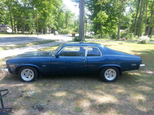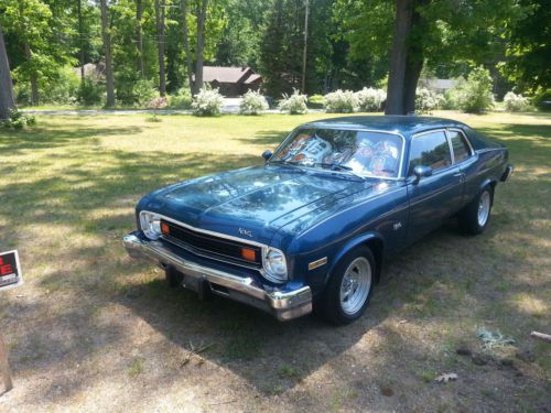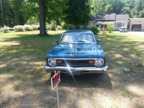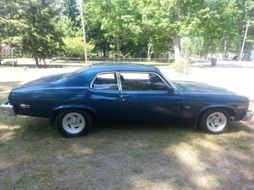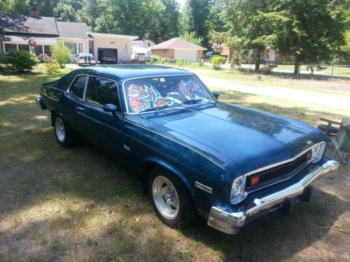 This is a 1974 Chevy Nova 2 door. The car has had the engine and trans changed out and the paint color changed, sport mirrors added but NO MAJOR BODY WORK. the body is in great shape. undercarriage is rust free, only place with rust in the inside of the truck and that is just surface rust from this last winter. other that that the rear bumper has a small spot of corrosion and the passengers door has a 3 inch scratch that has been touched up but paint. The engine was installed last spring. it is a 350 4 bolt main bored .030 over. less then 400 miles on the engine since installed. The trans is a Saginaw 4 speed. Original drum brakes all the way around. car has 84000 original miles on body. Car was painted from red to blue about 7 years ago. still have the paper work with paint codes. Also has 2 new "Nova" badges and a new set of 3.73 grears. Ring and pinion were never installed in car. Runs and drives Great. please message with any questions. |