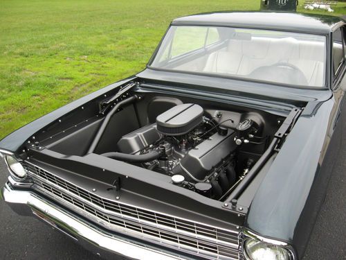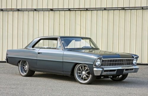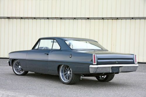 1967 Chevrolet Nova. Award-Winning, Pro-Touring Restomod. Professional Rotisserie built from the ground up. Featured in Super Chevy Magazine (Sept. 2012), Hot Rods & Harleys Magazine (Oct. 2012), many manufacturing catalogs, advertisements and online publications. Fun to drive, with plenty of power. Very comfortable ride and a great cruiser. Meticulous attention to detail top to bottom. Flawless condition inside and out. Absolute MUST SEE & DRIVE. Only 1,300 Miles since completed. Over 1,500 hours of Professional Build Time. Please feel free to call with any questions 732.766-6001 Engine: GM Performance ZZ454 Long Block ‘Crate’. GM Transmission: Brand New TH400, Full Manual Reverse Pattern Valve Body. Powder Coated Black Case. Rear End: Currie 9+ Housing w/ Tru Trac Posi, 3.08:1 gears. Sanded Smooth and Painted Satin Black. Front – Chassisworks G-Street Front frame w/ Powder Coated G-Street Upper & Lower Control Arms, Forged 2" Drop Spindles, Manual Rack & Pinion Steering, 1" Sway Bar and QA1 Single Adjustable Coil-Overs. The Entire Frame and Components were all smoothed of exposed welds. They were then hand sanded for a flush seamless look. 13” Wilwood E-Coated Rotors and 4 Piston Calipers. Rear - Mini Tubbed (wells were welded and sanded / ground down smooth and made to look factory and untouched). TCI 4-Link, Subframe Connectors, Diagonal Track Bar, QA1 Coil-over Shocks and 12.19” Wildwood E-Coated Rotors and 4 Piston Calipers. All components were sanded smooth and powder coated Matte Black for an OEM look Intro ID Luxury Wheels (ID:321) in Graphite Powder Coat, Hankook V12 Evo Tires; Size -18x8 (215/40/18) Front; 19x11 (285/35/19) Rear Body: Started as a super solid, all original shell. Custom altered and Smoothed Firewall. Filled, Smoothed & Boxed radiator support. Custom Front Radiator / Grill Filler (Valance), Filled and Smoothed Upper Cowl Panel and eliminated Wipers. Shaved Door Locks. Shaved and Smoothed Door Jambs. Shaved and Smoothed Rocker Pinch Welds. Filled and Smoothed body seams. Reshaped trunk line. Smoothed Inner Fender Panels, Wheel Wells and Lower Valance. Shaved Exterior Mirrors. Eliminated Body Clutter from Engine Compartment. ALL Exterior Trim was restored to concourse specs and then Powder Coated Matte Black. Underside of Body was Stripped, Smoothed and Sprayed in “Raptor” bedliner material. Inside of Bumpers and Front Fenders were smoothed and then undercoated for protection. Tons of Powder Coated and Anodized Parts. Stainless Buttonhead bolts and one-off machined billet washers used through-out (even unseen areas). Lots of Proto-type Parts and one off machined pieces. All body gaps and panels fit they way they should. Misc. Items: Auto Rod Controls - Hidden Switch Panel mounted in center console (operates ignition, starter, fuel pump, fans, lights) MODO Innovations - Electric Trunk Release (hidden switch in center console) Ring Brothers - Hood Hinges, Exterior Door Handles (anodized black) Clayton Machine Works - Interior Door Handles, Window Cranks, Billet Trim (anodized black) Marquez Design - One Piece Billet Tail Lights (solid red lens) PRC (Performance Rod & Custom) - Double Pass Radiator w/ dual Spal 12" fans & Shroud Ultra-Leatherette – Additional Info and over 200+ Build Photos available to serious inquires (must be contacted by phone). (NOTE: This car does NOT have a horn, AC, Heat, Stereo, Wipers, PS, PB, PW or PDL but is Pre-Wired for all mentioned for future install if desired. It has seat belts, lights and turn signals and is street legal in its current residing state. Buyer must check his/her local laws) Winning bidder must contact me within 24 hours and full
