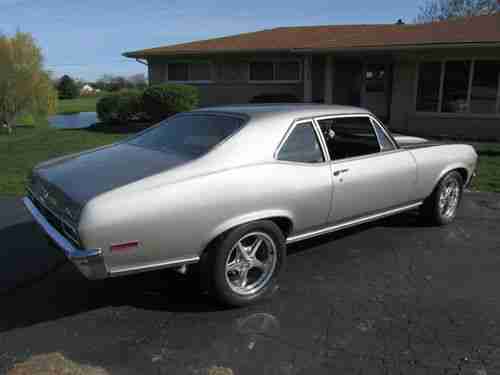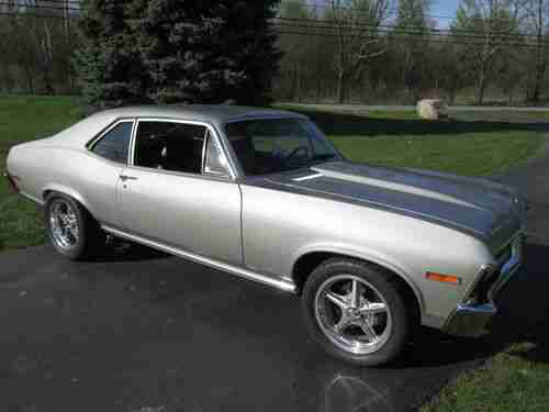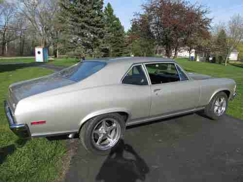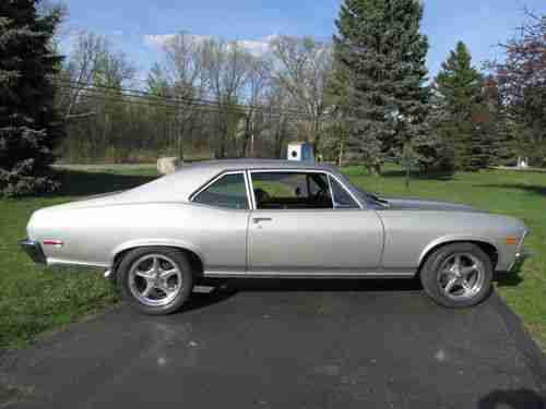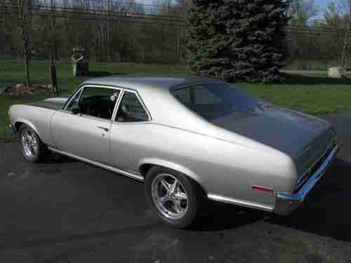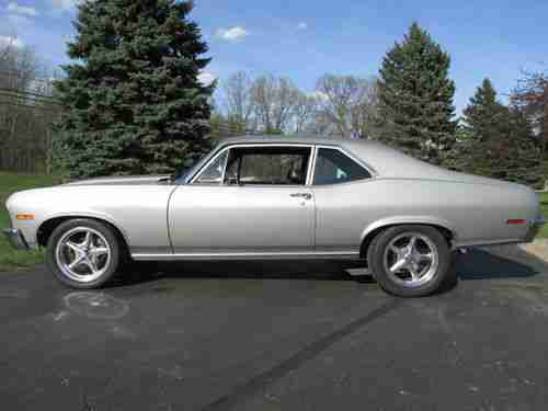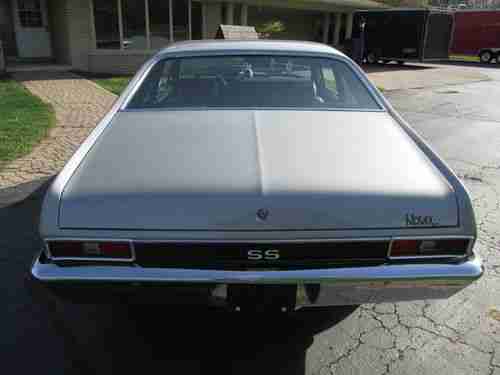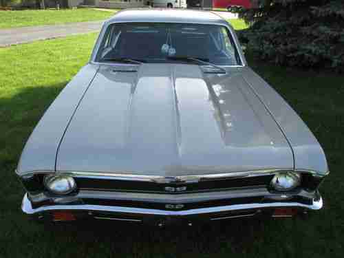 Gorgeous 1972 Nova SS, true SS 4 speed Car. This is a rust free all Original panel car with the exception of an aftermarket steel cowl hood. This beauty has gone through a complete nut and bolt restoration and has been painted the original color code 14, Silver Mist color with PPG base coat clear coat and wet sanded and wheeled slick as glass. All chrome and Stainless is in excellent condition. All Glass is original and in great condition. Have original SS Hood and louvers in great condition also. Originally a SS 350/ 4spd car, has been upgraded to a nicely built 454ci big block, with Correct big block heater core and heater box. Factory hi-rise intake, chrome valve covers and breather, Edelbrock 750cfm Carb, Headers with Flowmaster's dual exhaust kit. Original 4 speed transmission and 8.5 10 bolt posi rear end. Factory power disc brakes and power steering. Factory rear sway-bar. Interior is the Original Black vinyl Bench Seat with 4 speed on the floor. Interior is in excellent condition, After market Chrome tilt column with aftermarket tach attached, Aftermarket gauges under dash, Aftermarket Pioneer am/fm/cd player, with aftermarket Kickpanels with built in speakers and 6x9 speakers in rear package tray. Brand new 17 inch Thrash Star polished aluminum wheels. 17x7's all around with 225/50 tires in front and 255/50 tires in rear. Everything on this Vehicle works as it should.
