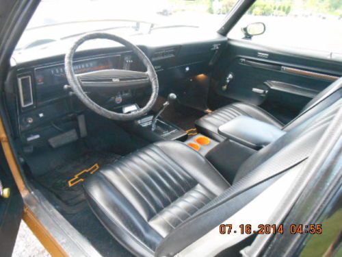 This is the car Chevy would have built in 1974 if government regulations would have allowed. Gone are the huge 5 MPH bumpers, and the anemic 190 HP 350 motor, replaced with a much more attractive and desirable 1970 Nova front end sheetmetal, grille, and bumpers, plus a fresh Crate 350 LT-1 370 HP solid lifter motor w/ aluminum intake and Holley carb. Original Turbo 350 and 10 bolt rear end were retained. This car started life as a loaded SS350 Nova, with factory floor shift w/ gauges, bucket seats, Disc brakes, A/C, PS, PB, tilt wheel, Custom interior package,and hatchback w/ fold down rear seat. Original paperwork includes build sheet, owners manual, etc. This is a rust free southern car and has a paperwork history and a clear North Carolina title. Further enhancements include a custom center console, headers, true dual exhaust with magnaflow mufflers, new carpet kit, and new tires. Clock works occasionally, and a era correct AM radio is included but not installed. No rips or tears inside, and black deluxe interior is excellent, outside is very good/excellent. Runs and drives great, no shakes, rattles, pulling, or any other issues. There is not another Nova quite like this one, hatchback rarity, convenience, and utility combined with the best looking front end ever placed on a Nova. Car has great power, and the A/C(rebuild compressor) blows icy cold |