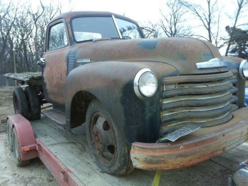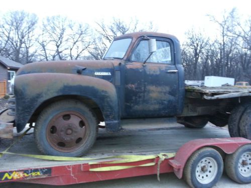 1949 Chevy Truck -4100 model -Flatbed shorty -Inline 6 cyl engine -Mostly solid This truck was running with the hoist working, three years ago; it shouldn't take much to get it going again. there is rust on both toe boards, and also some pinholes in the cab corners; this is very nice patina. back glass and one door glass is broken. it will need total restoration, but is a good one to work with; If you have any questions or if you need a shipping quote call me at 218-464-2821 I reserve the right to end the auction early for a local sale.