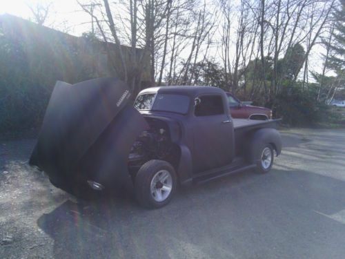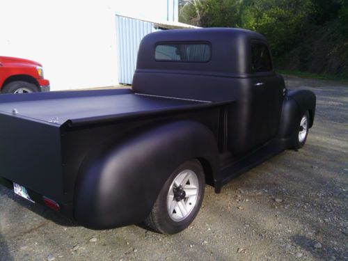 HERE IS A 1950 CHEVY 3100 PICKUP CUSTOM RAT ROD 305 TPI 5.0L V8, WITH A 5 SPEED TRANSMISSION WITH NEW CLUTCH ASSEMBLY. THE ENGINE,TRANSMISSION,DRIVE SHAFT,POSSE REAR END, TILT STEERING COLUMN AND GAUGES ARE OUT OF A 1987 PONTIAC FIREBIRD FORMULA. THE TRUCK INCLUDES A ELECTRIC RAM TILT HOOD, 3 INCH CHOPPED CAB, STEEL AND SHEET METAL COVER FOR BED, WHOLE TRUCK LOWERED 2 INCHES. THE EXHAUST RUNS HEADERS AND DUAL FLOWMASTERS. SONY CD PLAYER/AM,FM, WITH A 150 WATT AUDIOVOX AMP, AND 2 NEW 6.5 INCH KENWOOD SPEAKERS IN THE DOORS.