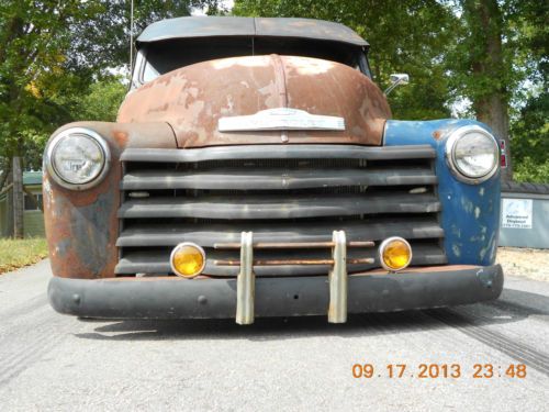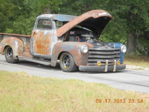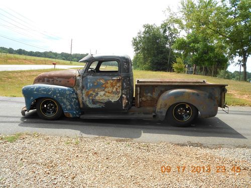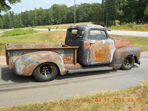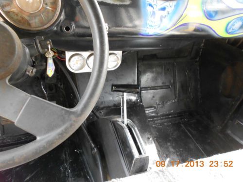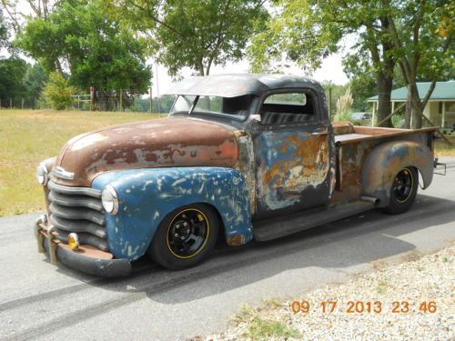 The Chop Top is a 1951 Chevrolet Rat Rod. It is mounted on a '85 S-10 frame with a 1980 350 engine and 400 turbo transmission. The wheel base is 119". Features of the truck include summit carburetor 4 barrel, dual exhaust, B&M shifter, power steering, and power brakes. It has a 10 bolt rear and 3.56 gear ratio. The top has been chopped 4". The truck also has 8x10" wheels front and back.