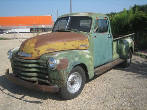 For Sale: 1952 Chevrolet 3-window 3/4T Long Bed Pick Up truck, (8) lug hubs, 16" steel wheels, heavy duty springs. Description: Our truck is a CLEAN, Excellent running, driving, road worthy truck that was purchased as a "display" truck for my welding business. The truck is virtually rust free, and when I say rust free, I don't mean the surface rust. She has plenty of that, but the floor boards, kick panels, rocker panels, cab bottoms, floor, fender wells and the bed itself are beautiful. She does have some rust-through surface(s) where the upper rear part of the front fenders meet the interior kick panels on the cab, but this is minor and not bad at all. The pictures in this listing of our truck ARE the pictures of the truck that you will be purchasing. This truck has a 12-volt battery but the truck itself has not been formally converted to a 12 volt system. All physical dash indications in the truck work perfectly. The truck shifts great, starts right up and runs like it's purring. It could be put to work immediately as is, or restored. This is really a nice, solid truck. She was purchased for a promotional vehicle for my welding business, but I get enough referrals via word of mouth, and we really need to purchase a tractor, so the truck is being sold. Condition: The truck has obviously had some bumps and scrapes along it's life. The driver's front fender was hit and poorly repaired at one time. The passenger side rear fender had a chain come loose in the snow and damaged the right rear fender at the rear lip as shown. None of this minor damage described is unrepairable. The rear bed is complete as it was original, but it is all under a sheet of 3/32" steel that was placed in the bed at some point during the truck's life down here in Texas, (see pics.). The glass is all there, but it's not all good. Most of it will have to be replaced. It's chipped, it's cracked, and it's pitted. The rubber gaskets around all the glass are virtually crusted completely hard and are unserviceable. The doors open and close without any sag whatsoever. I have removed all the old cracked-up upolstry to preserve the seat springs, which are in excellent condition. The windshield wipers work intermittantly. The wiring is all original; but she uses a push-button starter switch taped to the steering column to facilitate the starter action on the newer 235 engine. She has just had a coolant flush, and a fresh oil & oil filter change. New Parts: New keys, ignition, locks, Battery, battery cables, positive and negative, fuel pump, fuel tank, fuel cap, fuel line, fuel filter, & oil filter. Extras: The was ordered with the radio blank, turn signals, windshield wipers, and a heater. All of these items are installed and/or functioning in the truck. The truck will have a complete spare '52 grill assembly that goes with it, a full size mounted and balanced 16" rim and tire, as shown in the bed. I also have a 4-cross lug wrench and jack that will go with the truck. The truck has had a professionally welded/extended 12-Volt Battery tray fabricated to use the existing holes for the original, (smaller), battery box in the frame under the passenger side floor board. The 12V battery itself sits below the original floor board access panel, clearly visitable in the pictures, just like the stock 6 volt battery did. You can easilly pull the 12V battery up through the floor for removal. I do have the stock OEM radio blank plate that goes into the dash, which does go with the truck. I also have a spare door glass that is packaged for shipment. I will provide DETAILED pictures of any part of the car you wish, before you purchase and/or make an offer, if you're not seeing what you need to see in the pics I have posted. I will answer any questions completely, before you make your offer and/or purchase. Please do not hesitate to email me through the E-bay matrix, or simply speed it up by calling: (254) 368-7399. If you do not want your question posted to the listing, please let me know that in your contact and your contact will be kept private. Thank you for your interest and best of luck to all interested parties. The truck IS for sale locally here in Central Texas, Killeen 76548. The truck is located 55 minutes NNE of Austin City Central, 50 minutes SSW of Waco, TX and 2.5 hours NNE of San Antonio, 4.0 hours NNW of Houston, and 4.0 hours SSW of Dallas, TX. |