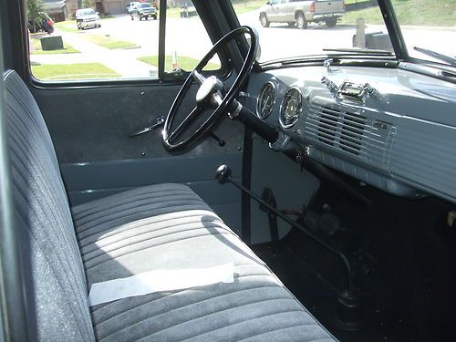 Inside, the truck has been finished in gray. The seats have been re-upholstered in velour and looks great. The door panels, headliner and carpet are all new. The dashboard is original and looks awesome, with all new gauges and an am-fm stereo system. The dash has not been altered at all.
