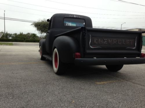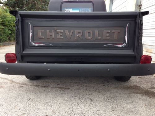 Truck has original power train, a 235 with four speed on the floor. Truck also, has a brand new master cylinder, rear break shoes with cylinders, brand new glass with seals. It has the original quarter window and do not open, windows are the original and show signs of age, has aftermarket temperature gauge, only the oil pressure and battery meter works on the original gauges, Headlights, break lights, driving light are fully functional; has no turn signals. Truck has had new cab corners installed and some body work done by previous owner all fenders have some dings and dents. In addition, it has been painted flat black with rustoleum bed liner and custom hand painted pinstriping. Bench seat is from an S10 with Mexican blanket. Truck runs and drives good and has light valve train noise, steering box and rear differential have a small leak. Floor pans need to be patched up or replaced. ignition switch is broken i us a screw driver to turn it screw driver come with truck, and pass door inside handle is broken, the truck is perfect for your local shows or as a bar hopper draws a lot of attention any where I go....