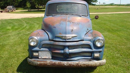 1954 CHEVY 3100 SERIES SHORTBOX HALFTON MODEL. HAS BEEN STORED INSIDE FOR THE LAST 25 YEARS, A TRUE BARN FIND!!! COMPLETE UNDER THE HOOD! EVEN HAS THE OIL BATH AIR CLEANER. MOTOR IS NOT RUNNING! STUCK? NOT SURE. TRANNY IS A 3 SPEED ON THE TREE. THIS IS A VERY STRAIGHT PICKUP FOR THE YEAR! ONLY A COUPLE MINOR MINOR DINGS! HAS SOME NICE PATINA ON IT! VERY HARD TO FIND IN THIS CONDITION! IT DOES HAVE A LIL RUST ON DRIVERS SIDE CAB CORNER. THE FRAME IS ROCK SOLID ALONG WITH A VERY SOLID BOX! WHICH IS RARE TO FIND. NICE SOLID DOORS AND FRONT FENDERS. THIS WOULD MAKE AN AWESOME RAT ROD OR A VERY NICE RESTO PROJECT! VERY HARD TO FIND IN THIS SHAPE!!! I DO HAVE A CLEAR TITLE! TRUCK ROLLS NICELY! TAILGATE IS ALSO THERE.