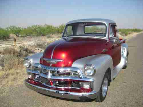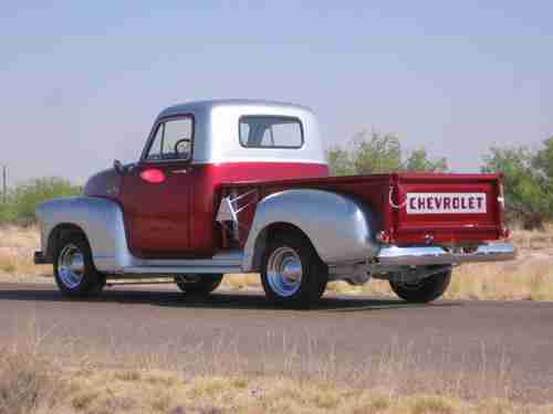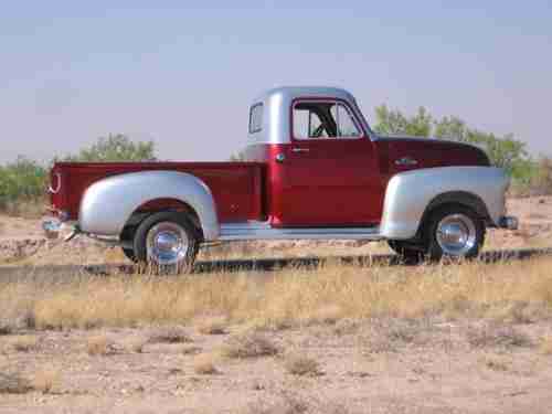 1955 Chevrolet 3100 3-Window Pickup, 235ci, 3 speed column, House of Kolor two tone Apple Red Kandy and Orion Silver Metallic. This pickup is the last year model of the Advanced Design trucks.