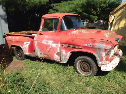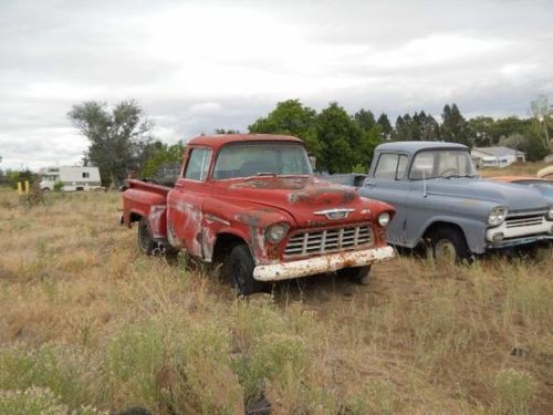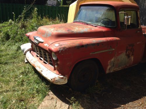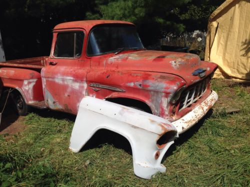 If you have been waiting for that perfect 1950's half ton Chevy truck project here it is. Up for auction is a very rare 1955 Chevrolet 3100 half ton Pickup Truck (Second Series). This truck has the rare Factory V8 Option & BIG BACK WINDOW deluxe cab options. The "V" emblems on the fenders denote this as a factory v8 truck. That and the fact the vin number shows it on the truck as well. It was built at Chevrolet's Oakland, California assembly plant and has been a West Coast only truck it's whole life. We do not salt the roads in the winters on the West Coast so our vehicles are always less rusty than antique cars from other parts of the USA that do salt the roads. This is the body style known as the 'Task Force" series. This particular truck has the short Stepside bed. This deluxe cab also came from the factory with the optional green tinted window glass. But the only glass still in great condition (fortunately) is the big back window and it is flawless. This truck has all the polished factory stainless window trim and stainless cab trim you see in the pictures. Rust in the usual places for an unrestored 49 year old vehicle. Cab corners are rusted, rust in bottom of doors, several small holes in floor, etc. Patch panels are available here on eBay and elsewhere to correct these items. The factory 265 v8 and manual transmission are missing in action but I have installed a used 1960's era 327 two barrel engine to replace the stock engine with. There is no carb on the engine. For now the engine is mounted at the front using the stock Chevrolet factory installed v8 mounts that this truck came with. There is no transmission or transmission mount currently in the vehicle. That is why the engine is tilted in the engine compartment. It is perfectly safe for towing or transport as it is currently mounted. Bone stock radiator in very nice condition. The inner fender panels are in perfect undamaged condition and they have never been chopped up or modified for headers. The stock six lug rearend has been swapped for a 1970 Camaro 10 bolt rearend with 5 lugs. The stock six lug front brake drums were replaced with regular 5 lug Chevrolet car drums. The stock front axle is still in place. ***PLEASE NOTE: The mag on the left rear of truck was used to move truck around. It is not included in this sale, you will receive a black steel wheel for transport just like the other three wheels on the truck in the pictures. But please look to see that the mag is a 15" x 8" mag wheel and look how nice that size mag and tire fits within the fender with the use of the stock Camaro width rearend . **** The stock seat is there but will need recovered. The right (passenger) front fender has a dent and is not worth fixing but I am including with this auction a dent free 1957 pickup passenger fender to replace it with. The fender emblems sit higher on a 1957, those holes would just be welded in and new holes drilled for the 1955 fender emblem and v8 emblem. There are, of course, numerous smaller dents throughout on truck because, as mentioned before, this is an unrestored vehicle. Stock gauges. The radio slot was modified for an 8 track player back in the day. Stock steering wheel, horn button and steering column. This vehicle steers so it can be loaded but it currently has NO operational brakes. This truck needs TOTAL RESTORATION before it will be roadworthy. I have loaded 24 pictures (the maximum number of pictures allowed by eBay) so that you can honestly and fairly evaluate the condition of what is being auctioned here. What you see is what you get. Vin plate is undamaged, unmolested and still attached in stock pillar location. This truck comes with a CLEAR Washington state title. It is NOT a salvage or reconstructed title. If you have any questions feel free to email me at any time before the auction ends. $500 non-refundable deposit required within 48 hours of auction's close. Balance must be paid within 7 days of auction's close . I can store for 30 days after the end of auction for free. Shipping details and payment for shipping must be worked out by the winning bidder but we will assist with loading of the vehicle. Thank you and good luck on the auction. ****PLEASE NOTE: I HAVE THE FOLLOWING ITEMS (brand new in factory sealed boxes, receipts still attached to the boxes) PERFORMANCE ONLINE WAREHOUSE 12 inch (oversize) heavy duty front disc brake conversion kit that includes 5 lug vented and cross drilled brake disc, calipers, pads, mounting brackets, new wheel bearings / races and stainless braided brake lines for mounting to stock 1955-1959 Chevrolet pickup truck front axle. I also have (new in the unopened factory sealed box) a complete PERFORMANCE ONLINE WAREHOUSE one inch diameter front sway bar kit specifically made for this year and model truck for mounting to the stock front axle of a 1955-1959 Chevrolet pickup truck for better handling in corners and a pair of PERFORMANCE ONLINE WAREHOUSE front gas BILSTEIN shocks (still in factory sealed boxes with receipt attached). THESE ITEMS ARE NOT INCLUDED IN THE WINNING PRICE OF THIS RESERVE AUCTION BUT I WILL SELL (at extra cost) TO THE WINNING BIDDER AT 25% OFF THE PRICE I PAID FOR THESE ITEMS. Otherwise I will sell the parts at another time on eBay in their own separate auctions. Winning bidder does NOT have to buy these items to complete this vehicle sale, it is merely an option being offered to the winning buyer . ***