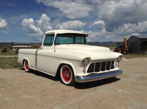 1955 Chevy Cameo with new crate 350 motor and new automatic transmission. Chassis done by "Mild to Wild" in Albuquerque NM. Truck has heat and AC from vintage air, power steering and brakes, and new interior. The truck also has new vintage white wall tires and new vintage rims. Truck runs and drives great and has been in New Mexico, so it has no rust. All the hard work is done and all it needs is some minor body work and paint. Please email with any questions. Thank you.