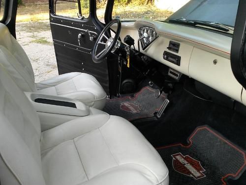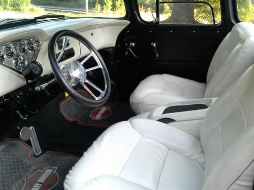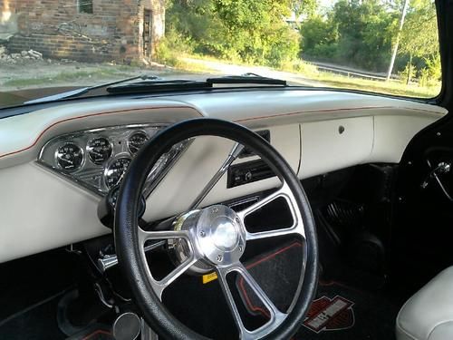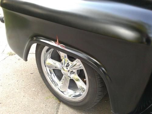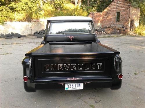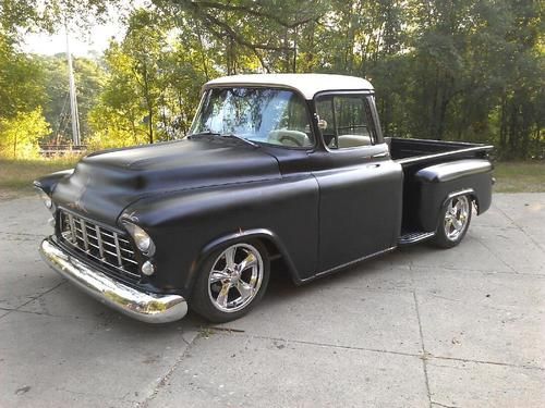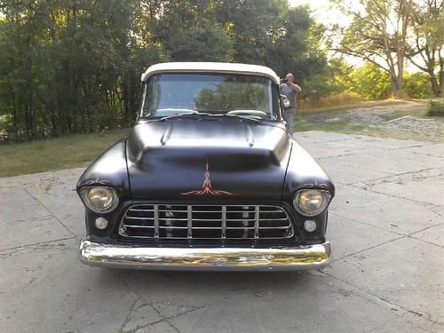 Up for auction is a 1955 Chevy Pickup Truck....the exterior is flat black and the roof is flat white...it has custom pin stiping...the interior is milk shake white and the seats are electric...there are 18" Boyd Coddington wheels on the front and 20" Boyd Coddington wheels on the rear; it has a wood floor box; it has boat style gas cap in the box with a fuel cell; the engine is a Small Block Chevy 40 with a turbo 400 transmission....it has a Heidts Mustang II front suspension with power rack...A/C and heat...it was built in 2010 with receipts....she's my daily driver when the weather is good and she turns heads...