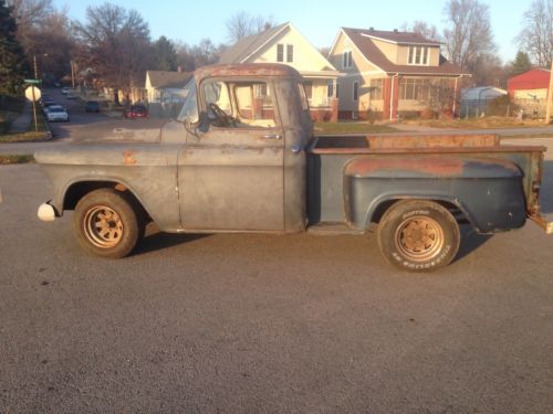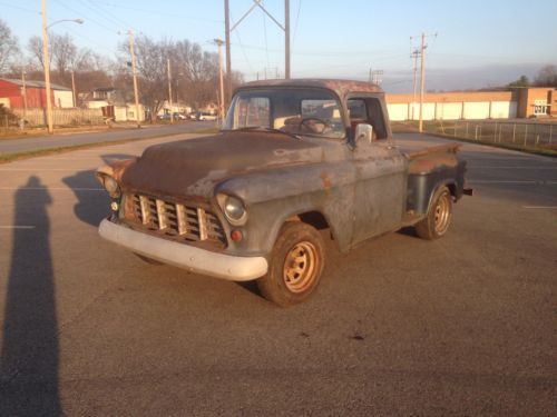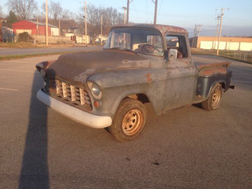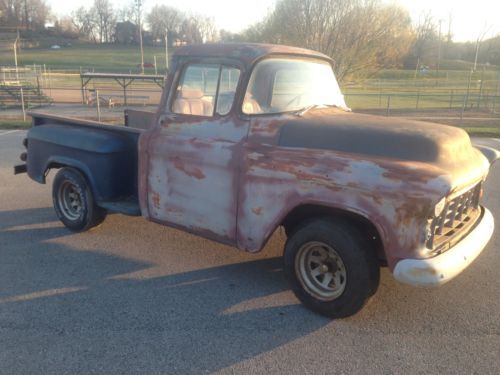 1955 chevy truck all original with only 80 thousand miles. it runs and drives very well, it has a new battery, new fule pump new points, new cap, new rotor and newer spark plugs and spark plug wires. the headlights and it looks like new wiring to the taillights is there but not currently hooked up . it has a bench seat out of something else in it im not sure what. all the glass is good, the windshield does have some fogging around the corners but nothing that effects the view. no bed floor and no tailgate. it has some rust in the floor step on the passanger side but nothing that makes anything un-solid. the doors don't drop when you open them or anything like that. it comes with extra glass, door trim, interior handles, wing windows the orginal rear bumper and some floor braces for the bed. the motor is a 235 with a 3 speed transmission with column shifter. the gas tank has been boiled out and has newer lines ran. starts up instantly no messing with crap for 5 min to get it to fire up. no drama with the title its clean and clear. 4000 obo if you have any questions at all shoot me an email or give me a call at 816--262-1743, text is better.