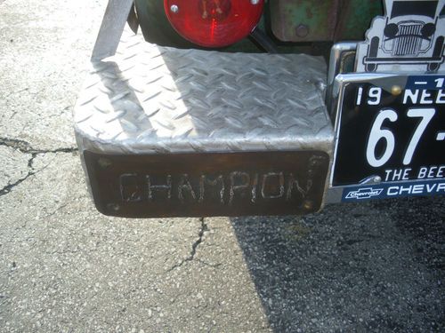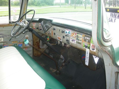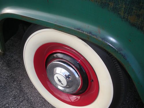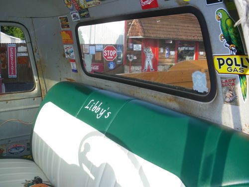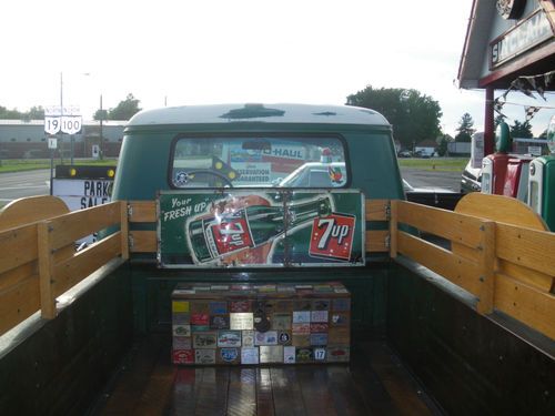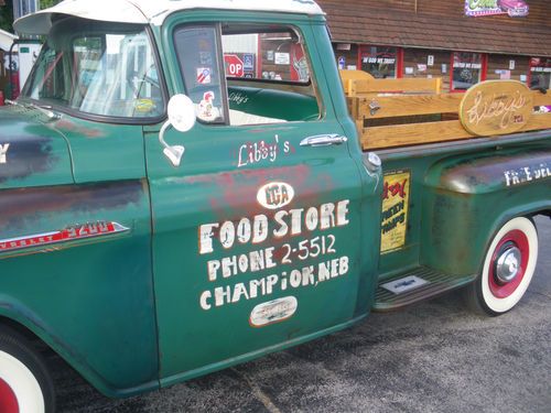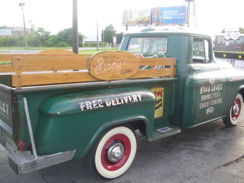 Meet Miss Libby, a 1956 Chevy 3200 pickup which started it's life as an IGA delivery store truck in Champion Nebraska. I purchased the truck at a tractor auction several years ago. At that time the lettering on the doors was still ledgeable although fading. The truck was running and we drove it home. After some serious consideration we decided to enhance the existing lettering and at that time we changed the original name to Libby's IGA after my granddaughter. With the exception of the roof and visor we left the original paint in tact and painted the roof and visor white along with a little tasteful pin stripping. The bed is as we found it except we applied 10 coats of polyurethane on the wood and clear coated the bed sides. We added a new oak rack, the S&H green stamp sign and the 7up sign in the bed. The original seat was recovered and the rest of the interior left as we found it. This truck still has it's original engine and 4 speed transmission as well as it's original shocks. The underside of the truck was steam cleaned and painted however we did not attempt to clean the engine and tranny. We replaced the exhaust, windshield, radiator, belts, and hoses. 4 new B.F. Goodrich Silver town bias ply wide whites were added along with new hubcaps and vintage trim rings painted red. We rebuilt the carburator, replaced the headliner and visors. As you can imagine this truck gets lots of attention and appeared on the front page of the Bellevue, Ohio Gazette in June of this year. The truck runs great, shifts fine, all lights and turn signals work as do all the gauges, horn, wipers, and heater. The speedometer was disconected when we got it and the odometer is not working so the true mileage is unknown. The rear pig has a small leak and the engine leaks when the truck sets and it does burn a little oil. The licence plates, tag toppers and wooden box in the bed are not included in this auction.