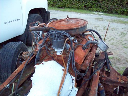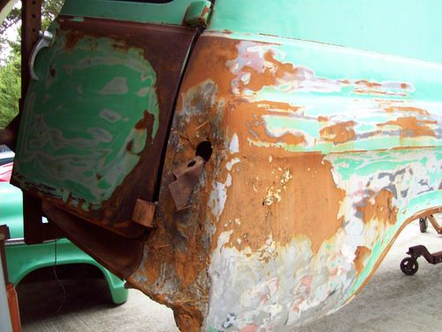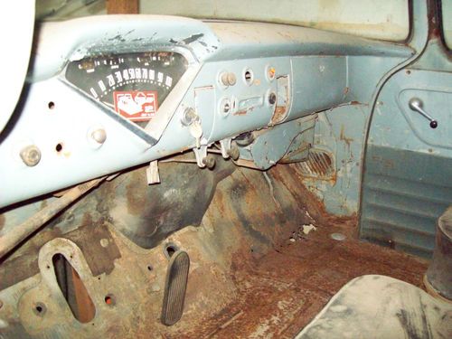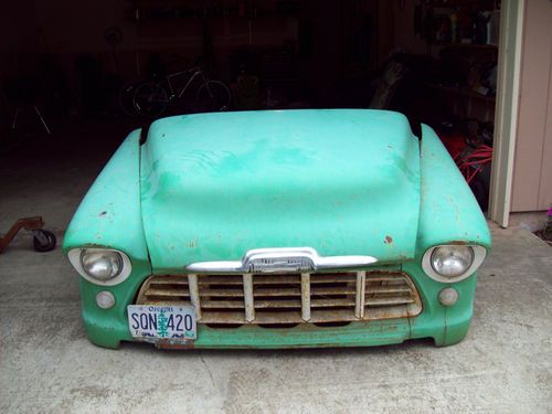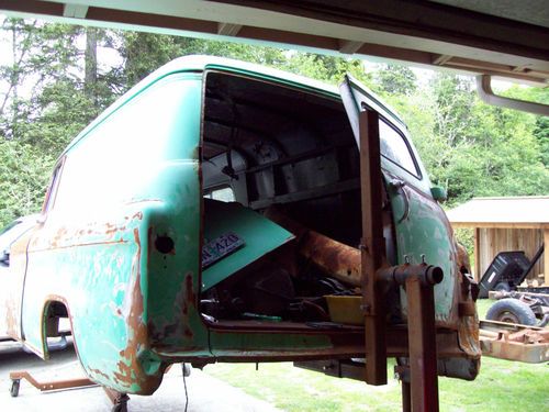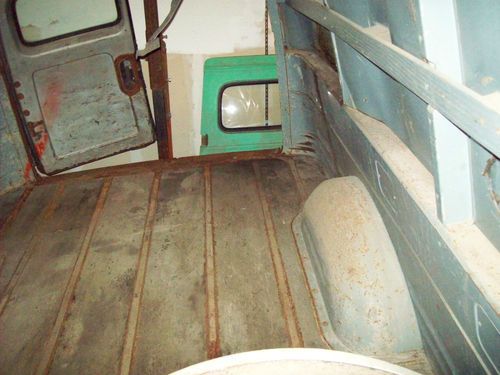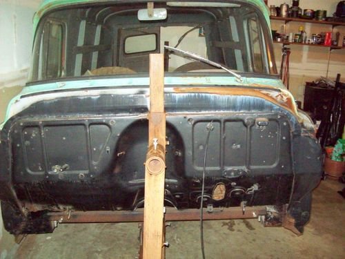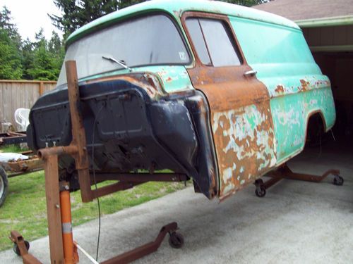 1956 Chevrolet Panel. Its life started as a Idaho State rig. 57 years later, here it is on a rotisserie. Overall its a pretty solid old rig. The passenger side floor panel needs help. The right rear corner needs help also. All the glass is in tact . It has a great front clip. The frame has A-arm suspension with front disc brakes. No clue from what. A lot of the rust shown in pics is just surface. The cargo area is in great shape. It does have a straight rear bumper, mirrors, gas tank,radiator and misc. nuts and bolts. Included is the rotisserie, another frame with a 1971 350/350 which was running till cab and box were removed. Tilt steering column with key out of a chevy. The title is clear and signed off by previous owner.Thanks for checking it out.