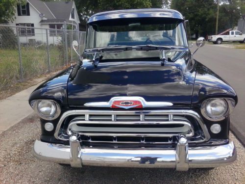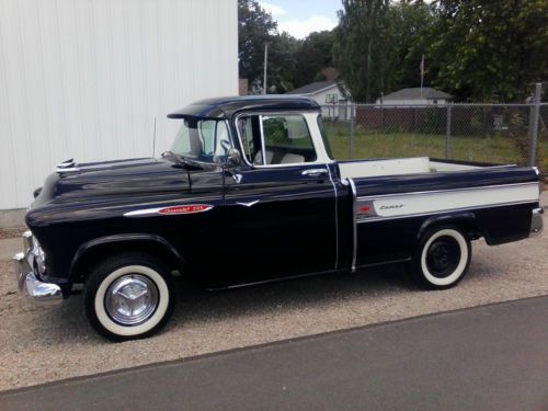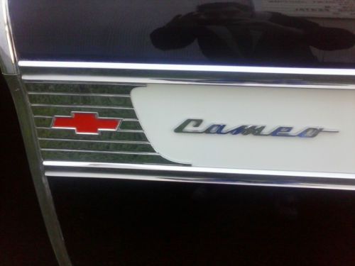 selling for a friend 1957 3124 chevy cameo truck. Torn down blasted and painted restored 20 years ago but still shows nice. Truck was done in factory black and bombay ivory, black and white interior, rebuilt motor. Runs and drives great, starting to show it's age but still very nice with no rot. Chrome showing some staining and peppering no pitting, minor paint chips and normal wear. 265 with 3 spd column shift stick with overdrive,good whitewall radial tires, exhaust 6 lug, am fm radio under seat. buyer has 7 days to complete sale, $1000 deposit required. please ask questions, pics are before cleanup
